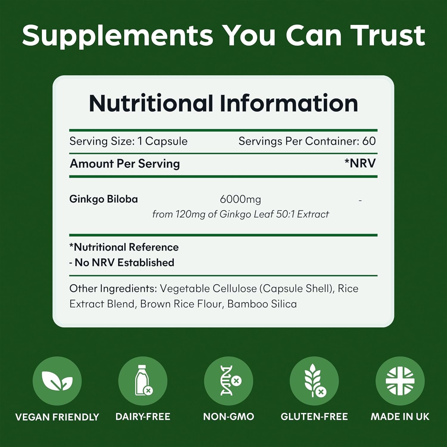 Purolabs Ginkgo Biloba Supplement 6000mg |High Strength 50:1 Ginkgo Biloba Extract | 60 Vegan Capsules for Men and Women | No Fillers | Made in The UK