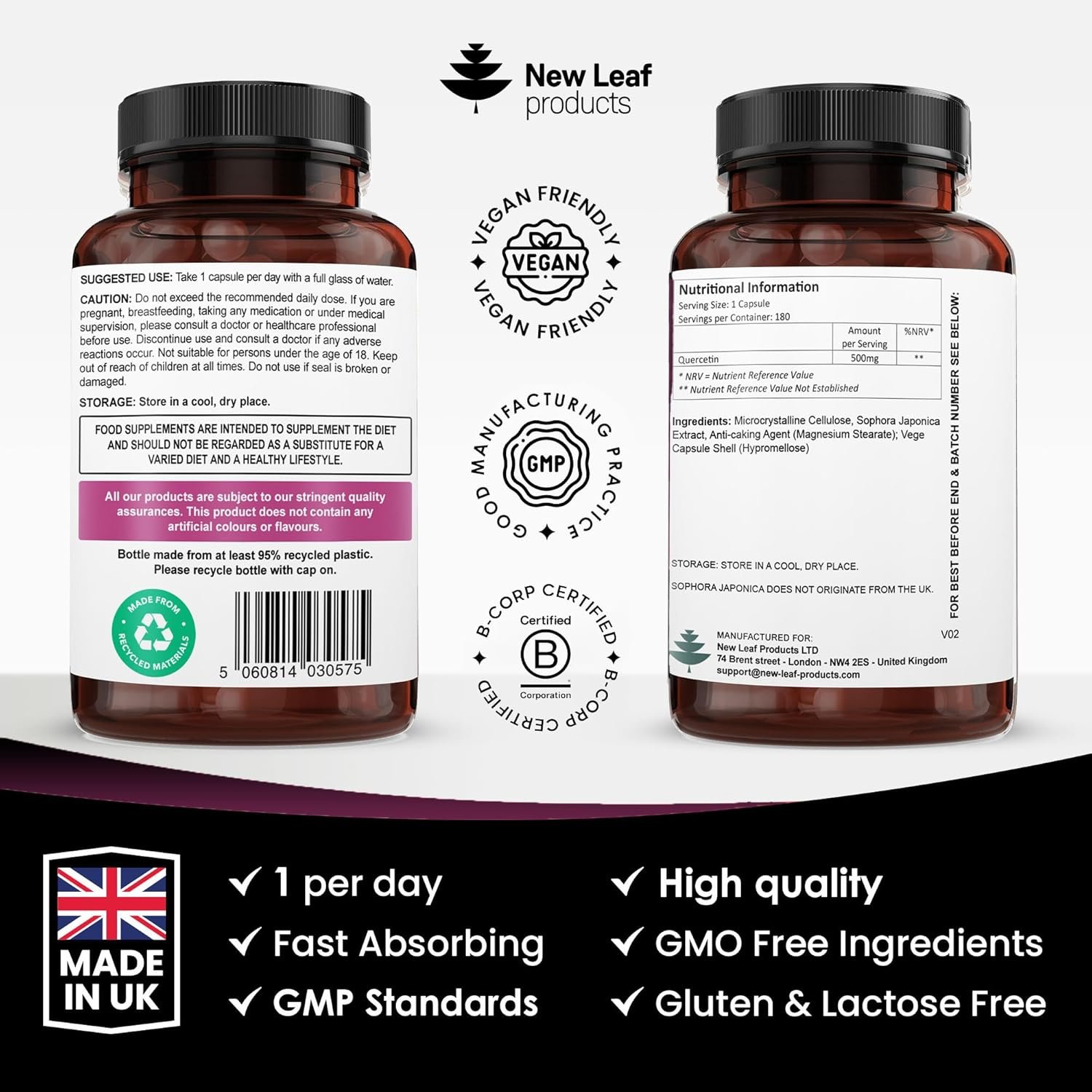 Quercetin 500mg High Strength Antioxidant Supplements (6 Months Supply) 180 Vegan Pure Quercetin Capsules Easy to Swallow – One A Day – Gluten Free & Non-GMO, Made in UK by New Leaf