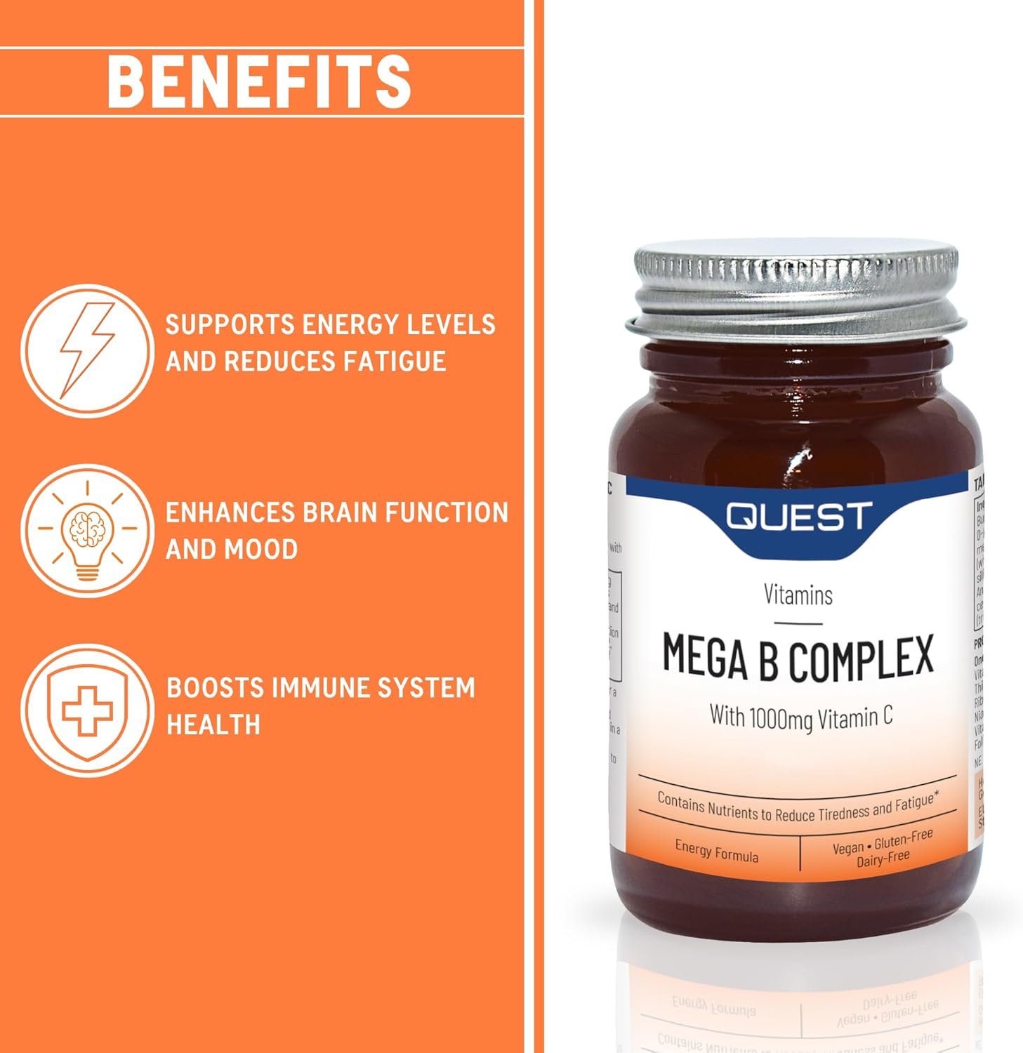 Quest – 60x Mega Vitamin B Complex Tablets. High Strength Vitamin B1-B2-B3-B6-B12, Biotin & C Supports Energy Production, Stress Response, Immune System & Brain Function (1 Pack)