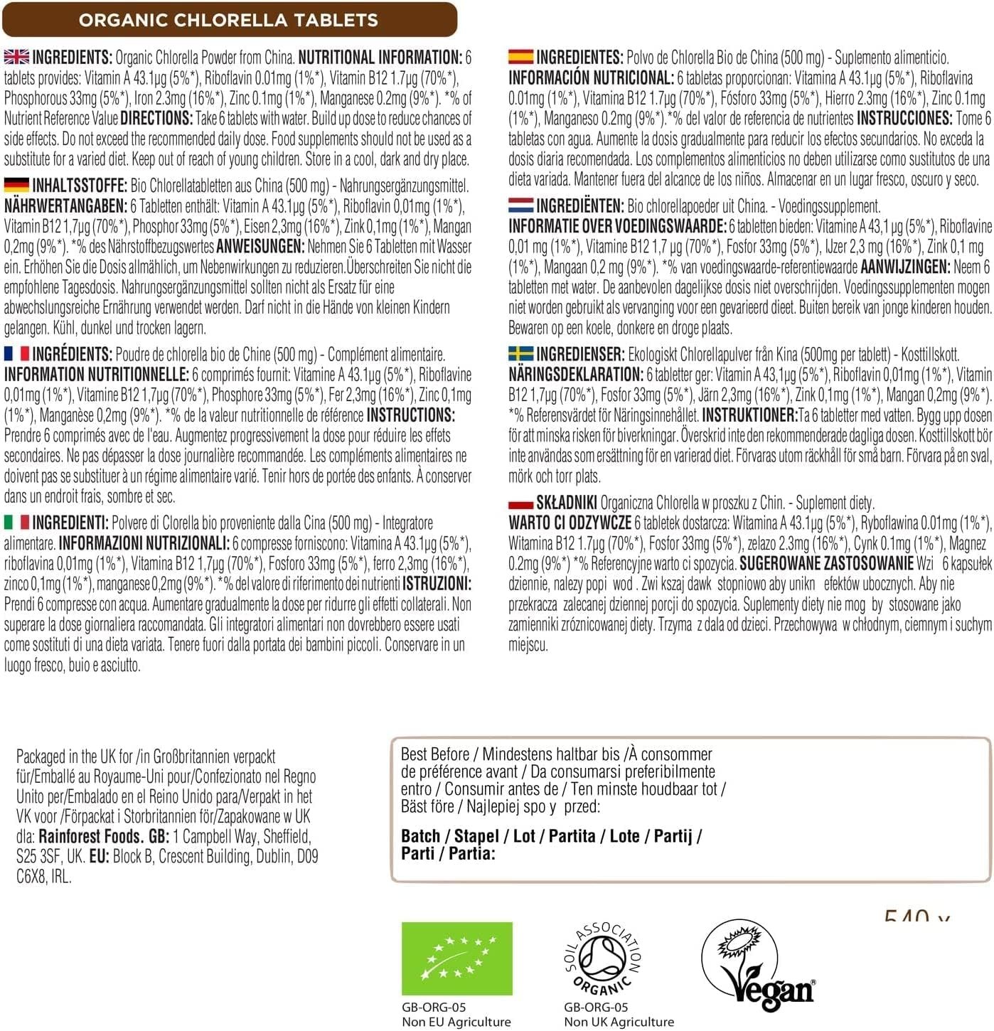 Rainforest Foods Organic Chlorella Tablets 300 x 500mgThis bottle 300 tablets. Each tablet contains 500mg of organic broken cell-wall Chlorella powder (Chlorella vulgaris).