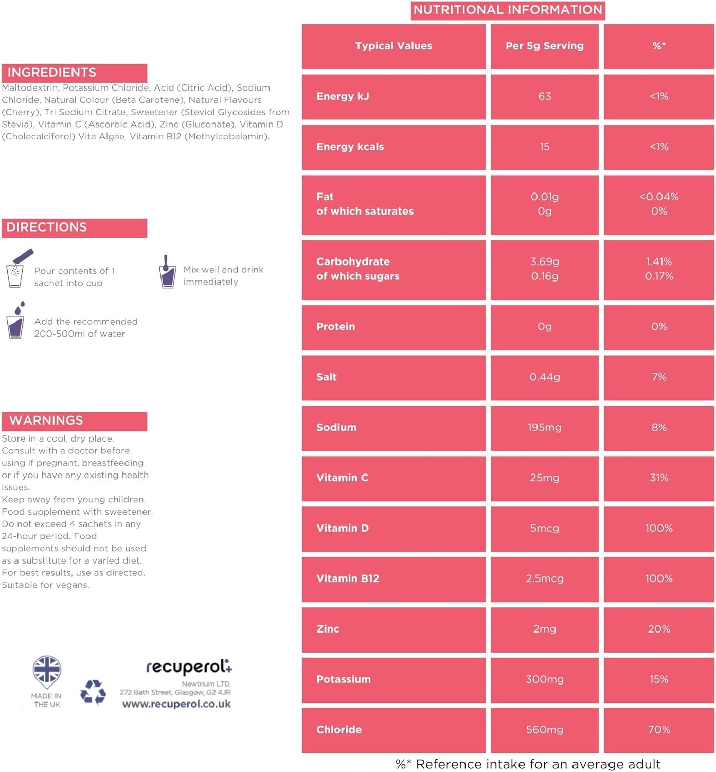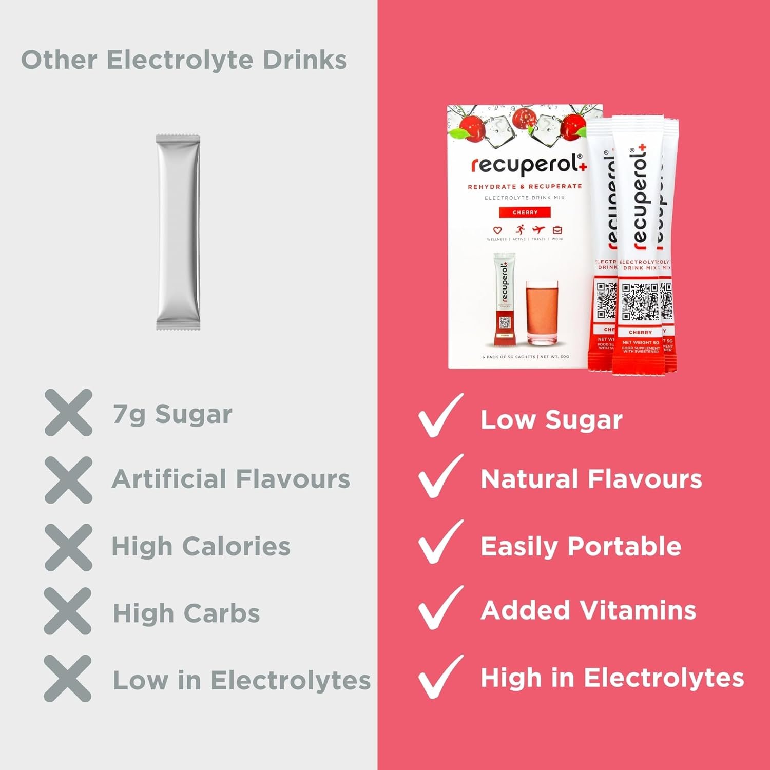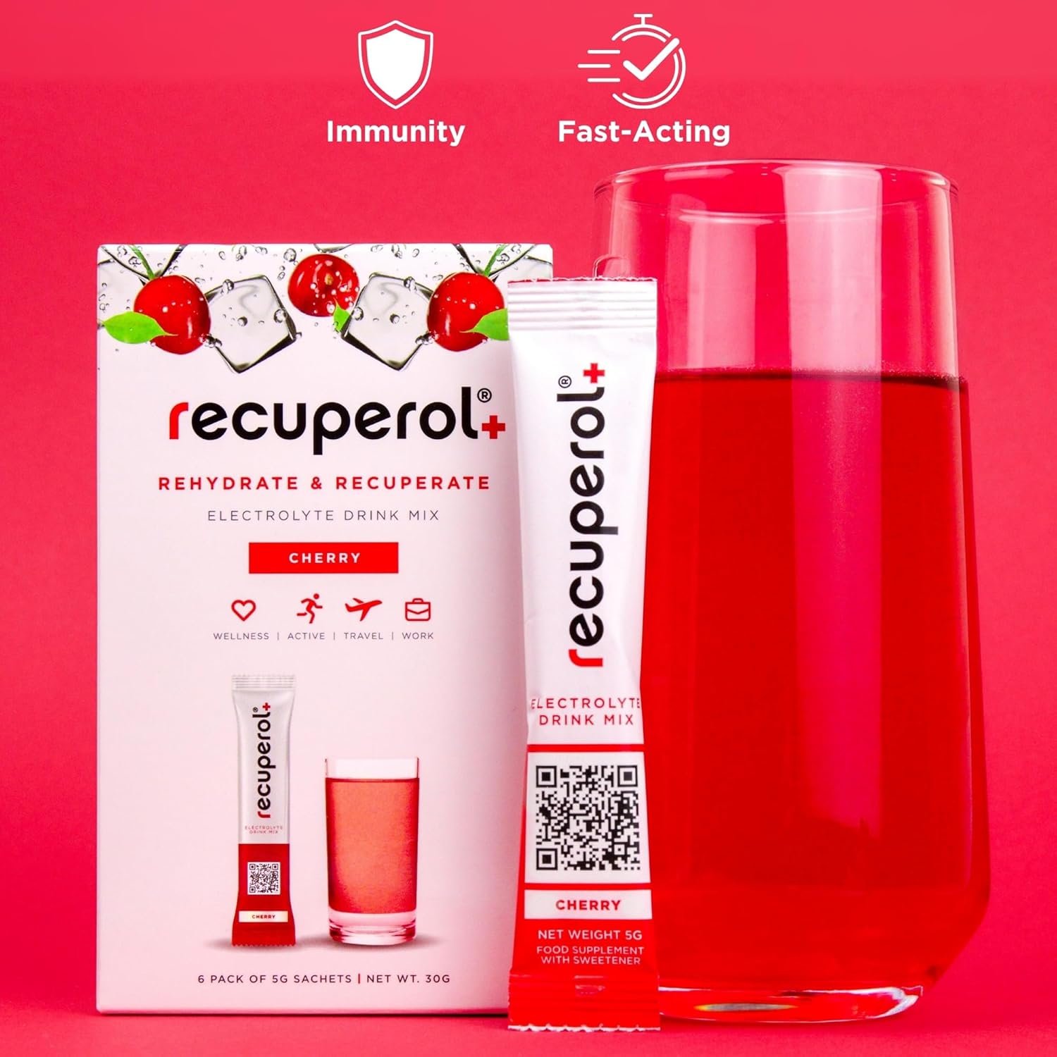 Recuperol Rehydration & Recovery Electrolytes Powder Supplement for Dehydration, 6 Sachets, Replace Mineral Salts & Fluids, Zinc, Vitamin C, B12, D3, Potassium, Natural Cherry Flavour