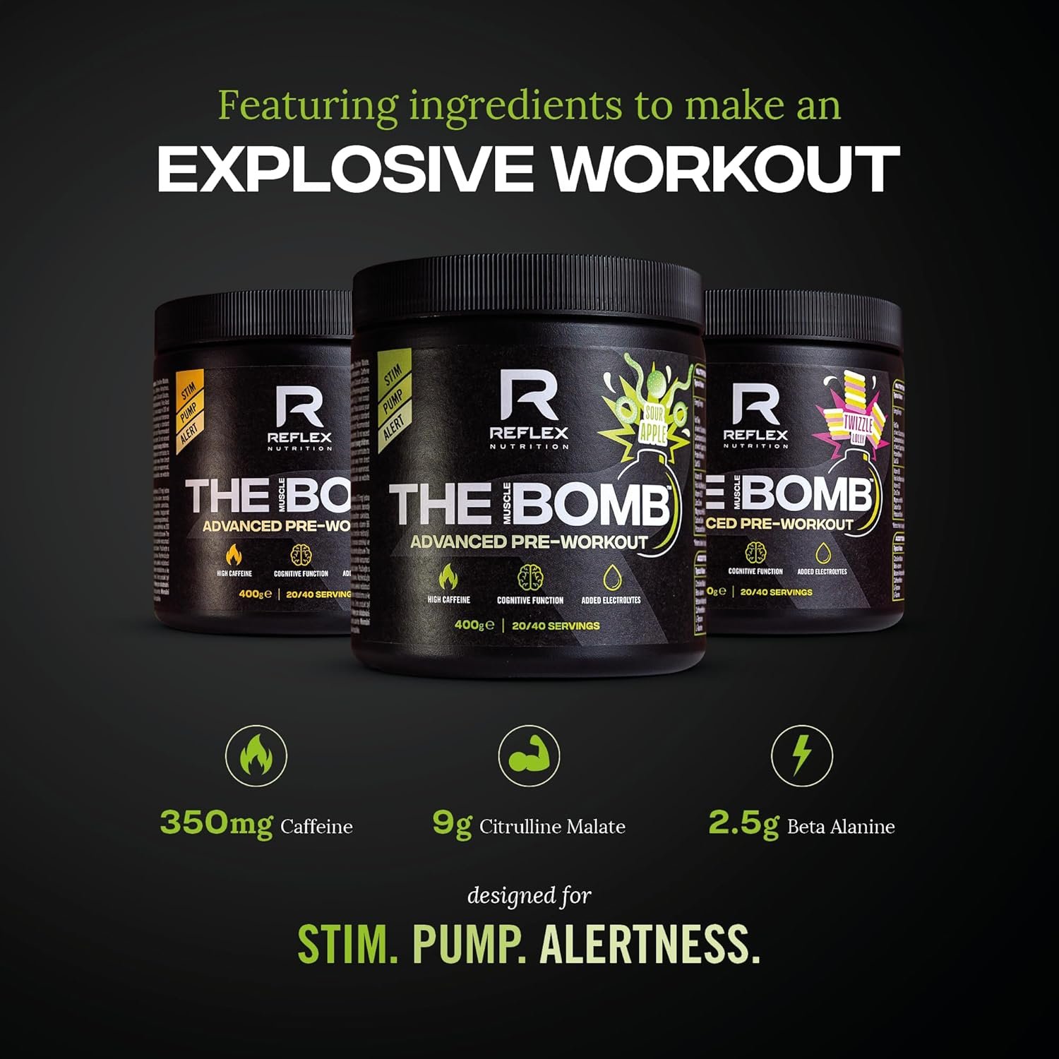 Reflex Nutrition The Muscle Bomb Caffeine Pre Workout Powder – 350mg Caffeine, 9g Citrulline Malate, 2.5g Beta Alanine – Energy, Pump & Focus for Explosive Workouts (Sour Apple, 400g, 20 Servings)