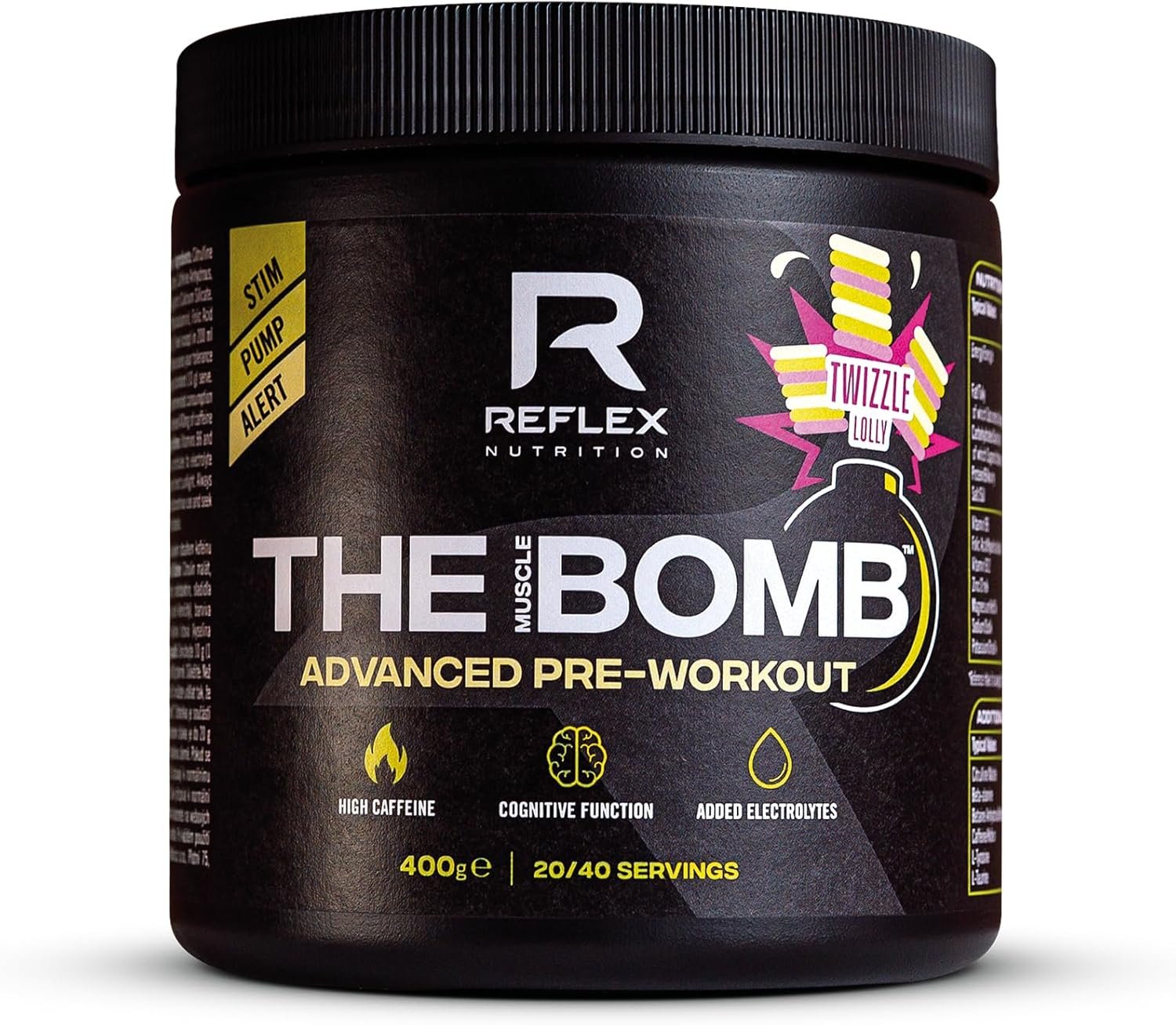 Reflex Nutrition The Muscle Bomb Caffeine Pre Workout Powder – 350mg Caffeine, 9g Citrulline Malate, 2.5g Beta Alanine – Energy, Pump & Focus for Explosive Workouts (Twizzle Lolly, 400g, 20 Servings)
