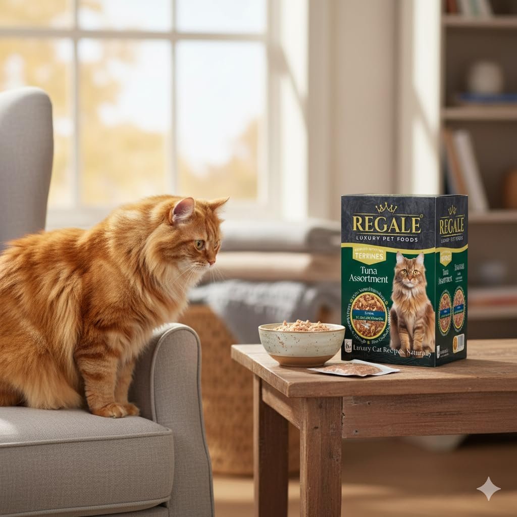 Give your cat the exceptional taste and nutrition they deserve with **REGALE Luxury Pet Foods**. Our Terrines, Tuna Assortment is a celebration of simple, high-quality ingredients, thoughtfully prepared to provide a meal that is both delicious and wholesome.