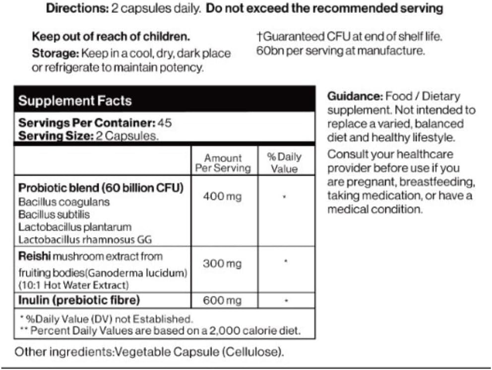 Dual-Action Formula for Gut & Immune Health Reishi mushroom extract combined with probiotics and prebiotic fibre to support gut balance, immune resilience and daily wellness.