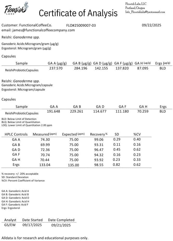 3000 mg Fruiting-Body Reishi Equivalent Delivering verified ganoderic acids (A, B, D, F & H) — the active triterpenes that define genuine Reishi potency and immune-supporting power.