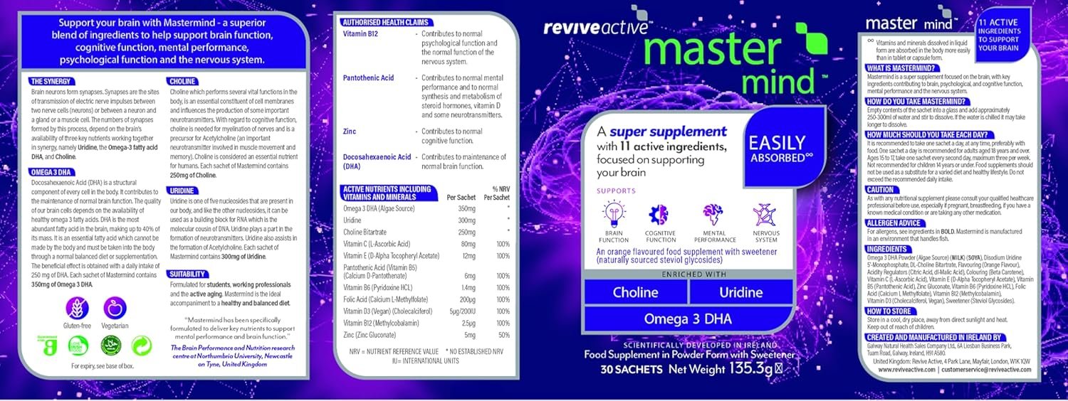 FREE FROM: Revive Active products are free from fillers, binders, stimulants or added artificial flavours or colours. Mastermind contains natural flavouring (orange), natural colour (beta carotene) and natural sweeteners. Sachets are Gluten Free and suitable for Vegetarians, but please note they are not Vegan and contain Milk and Soya.