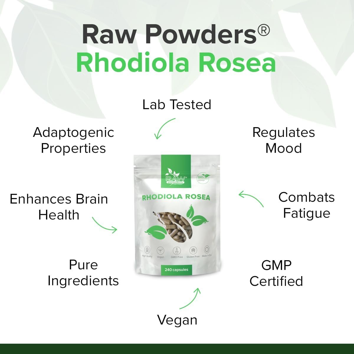 Rhodiola Rosea Extract 500mg, 240 Caps – Stress & Energy Support – Pure Ingredients, GMO & Gluten Free – GMP Certified Adaptogenic Herbal Supplement by Raw Powders