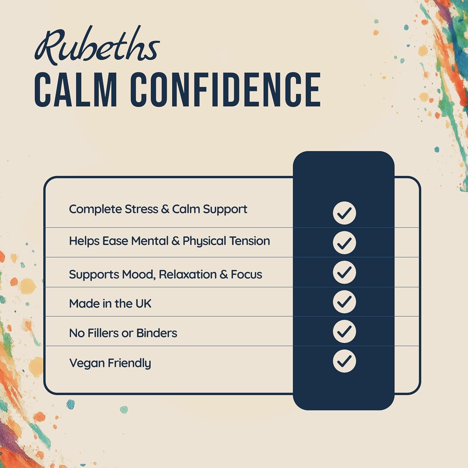 Rubeths Calm Confidence – Natural Calm & Focus Support Busy modern life can leave you feeling tense, restless, or overwhelmed. That’s why we created Calm Confidence — a simple, clean formula designed to support calm, focus, and balance without fillers or fluff. Each serving combines L-Theanine, Lemon Balm, Magnesium Glycinate, and Vitamin B6 — four ingredients chosen for their complementary roles in relaxation, nervous system support, and mental clarity. Made in the UK to the highest standards. Top Benefits Supports calm & relaxation – with L-Theanine and Lemon Balm, traditionally used to promote relaxation without drowsiness. Stress & anxiety support – Magnesium and Vitamin B6 contribute to normal psychological function, helping you stay steady under pressure. Focus & mental clarity – L-Theanine supports calm focus while Magnesium and B6 help reduce fatigue. Balanced mood & nervous system – Magnesium and Vitamin B6 contribute to normal functioning of the nervous system and psychological balance. Made in the UK, no fillers – a clean, simple formula with just four active ingredients you can trust. Frequently Asked Questions How long does it take to work? Some people notice calming support quickly, others after a few days of daily use. Consistency is key. When should I take it? Anytime. Many take it in the morning to stay steady through the day, others prefer evenings to unwind. Do I need to take it every day? Yes. Calm Confidence is designed for daily use. Ingredients like L-Theanine and Lemon Balm may provide quicker calming support, while Magnesium and B6 build gradually. Can I take it with food? Yes — with or without food. If you’re sensitive to supplements on an empty stomach, take it with a meal. Will it make me drowsy? No. Calm Confidence is formulated to support calm and focus without sedation. You should feel steady, not sleepy.
