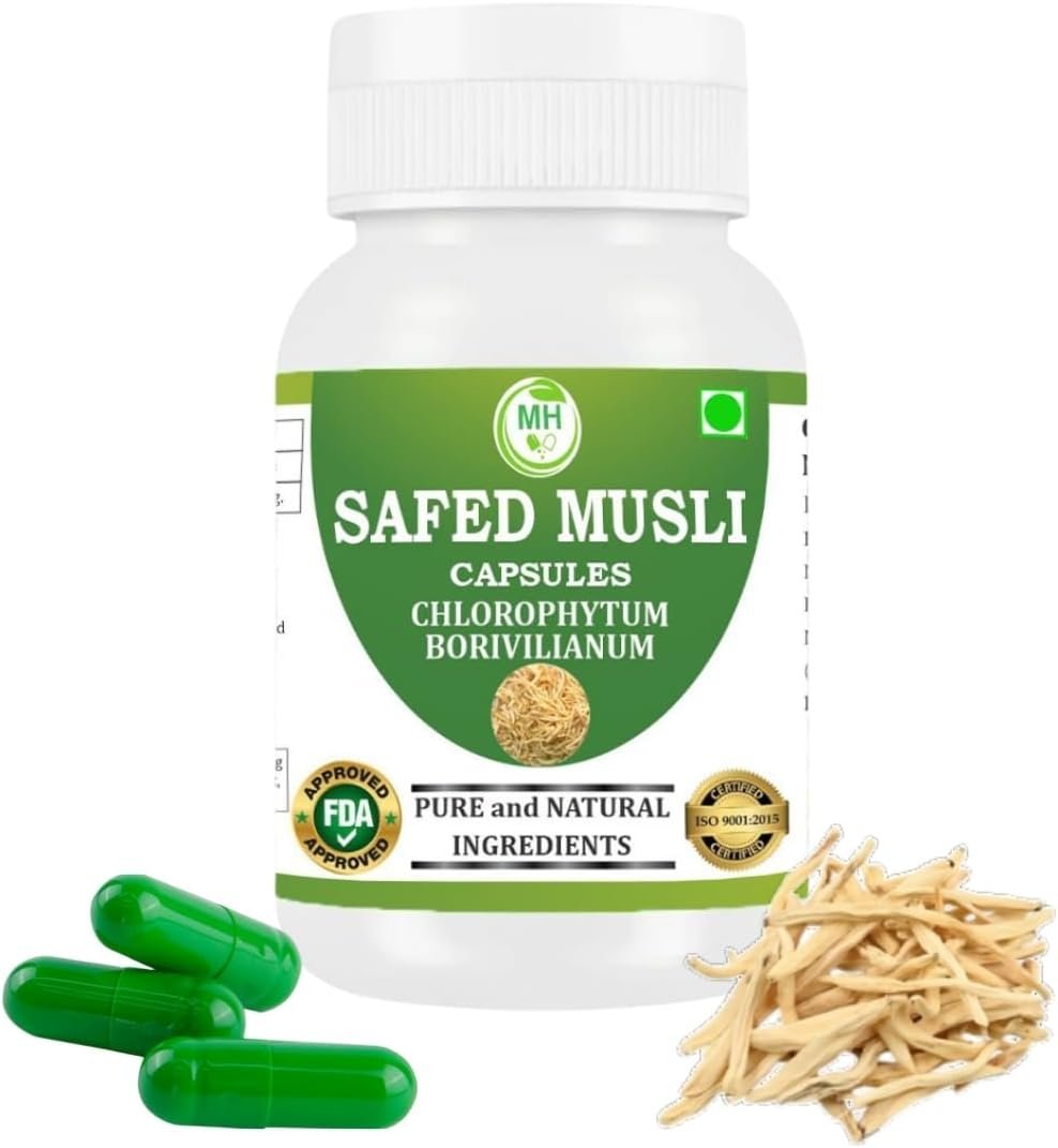 🔹 Power-Packed with Pure Safed Musli Extract Made from premium quality Safed Musli – a rare Ayurvedic herb sourced from India, known for its revitalizing and healing properties.