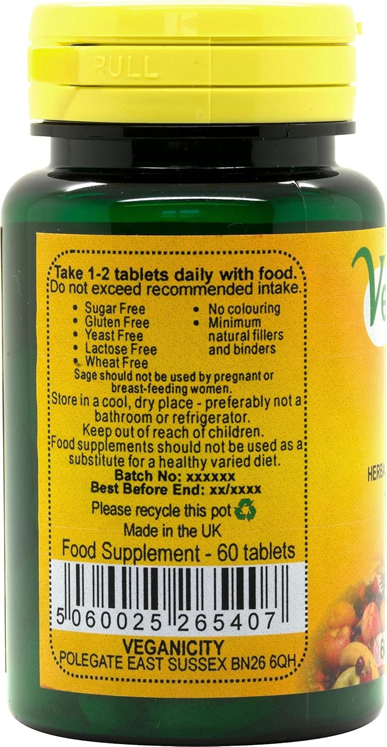 60 Vtabs of 400mg of Vegan Sage, to maintain proper digestion, gum health and maintain a healthy nervous system. Free from sugar, lactose, yeast, gluten and wheat with no colourings and minimal natural fillers and binders.