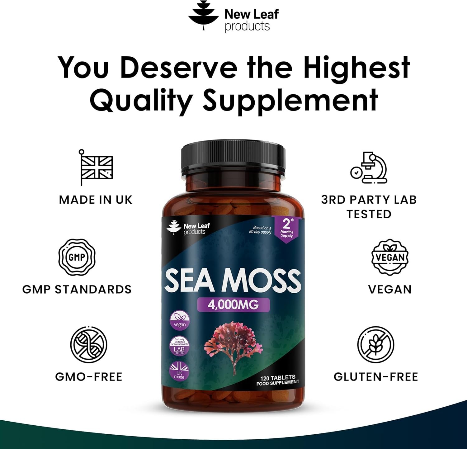SEA MOSS TABLETS EXTRACT – Each serving of our sea moss tablets provides 4000mg from 266.7mg of a 15:1 extract, there are two easy to swallow tablets per serving, and 120 tablets per bottle which will last up to two months.