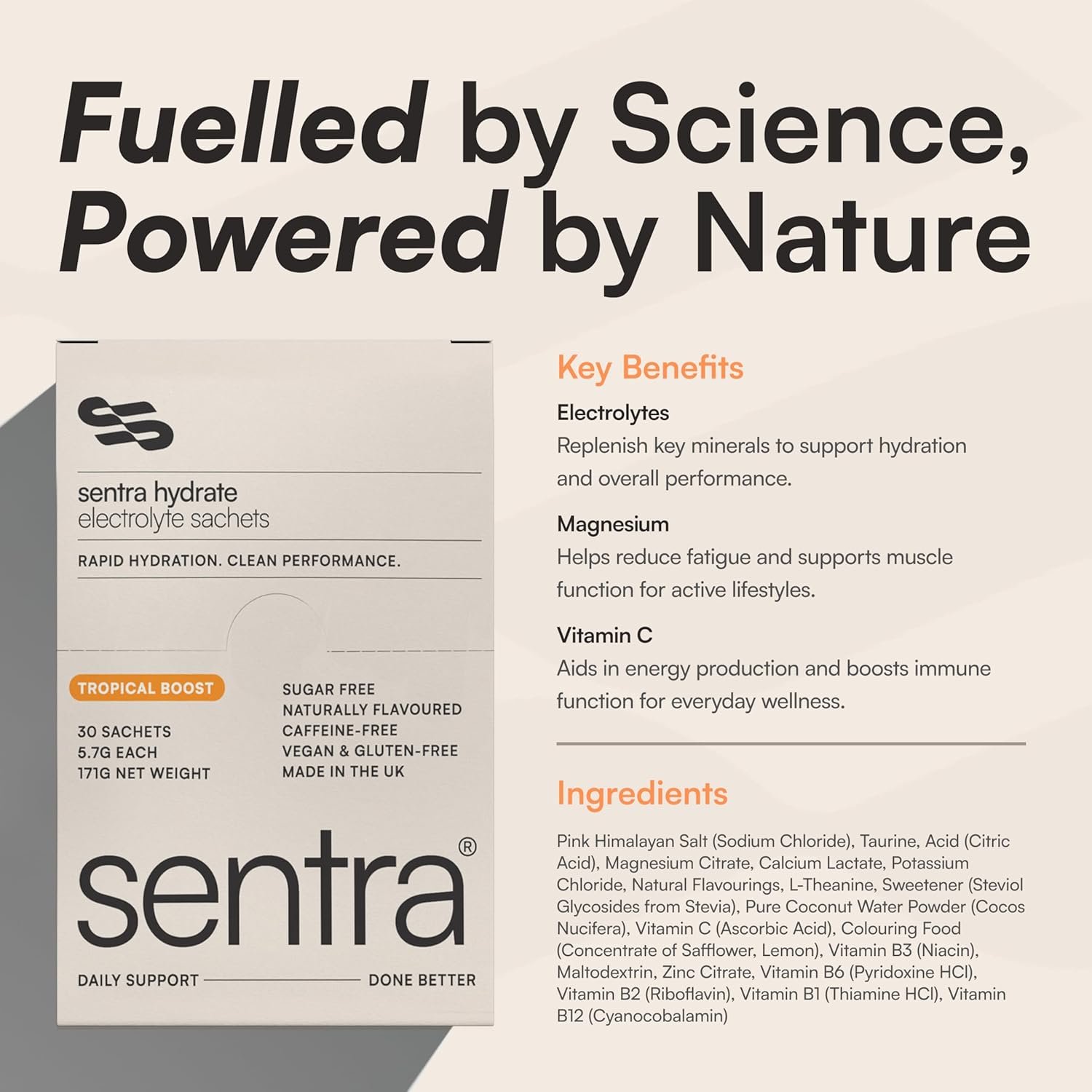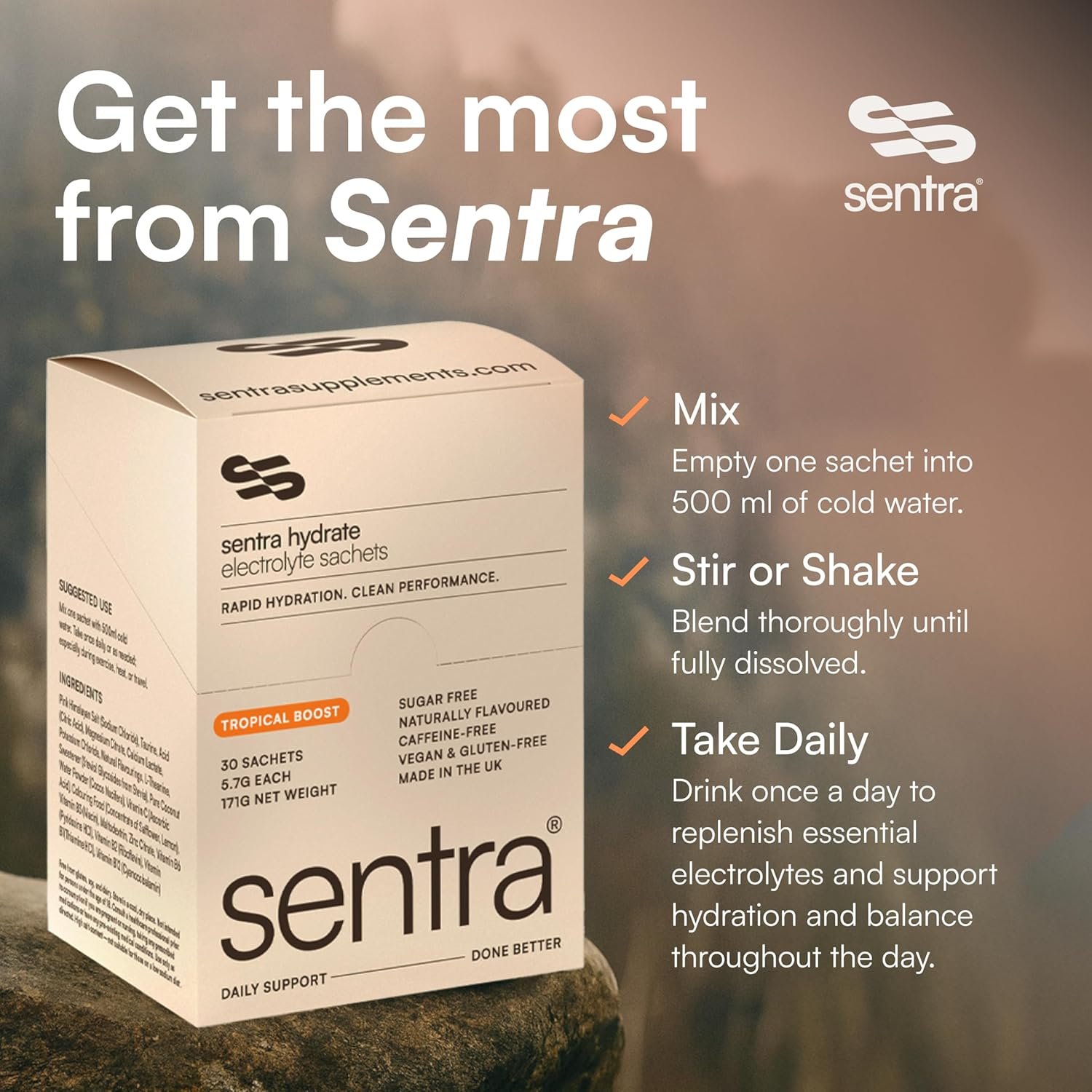Sentra Supplements – 95% of customers feel more hydrated, balanced and energised within their first 30 days. Join over 100,000 people who trust Sentra for daily electrolyte support. This is not a gimmick, but a science-backed hydration formula built on real results. No trendy blends or gimmicks, just essential electrolytes and natural flavour in a clean, convenient sachet format.