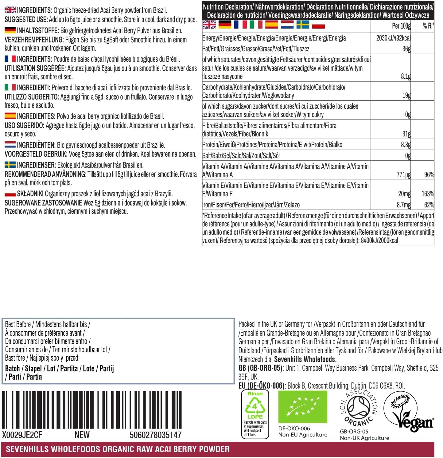 Sevenhills Wholefoods Organic Raw Acai Berry Powder, Freeze-Dried, from Brazil 100g