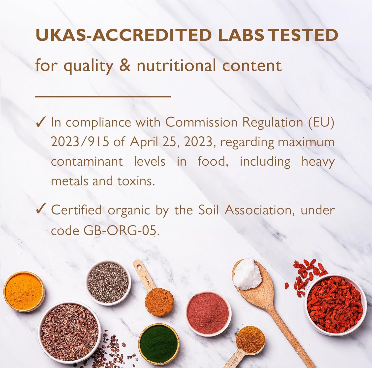 100% Pure: plant-based ingredients with no additives or preservatives. Our products uphold environmentally sustainable practices and undergo rigorous testing for heavy metals and mycotoxins, certified to EU organic standards according to Regulation (EU) 2018/848 and Great British Organic Standards by the Soil Association under the code GB-ORG-05.GMO-free, no allergens, non-irradiated.