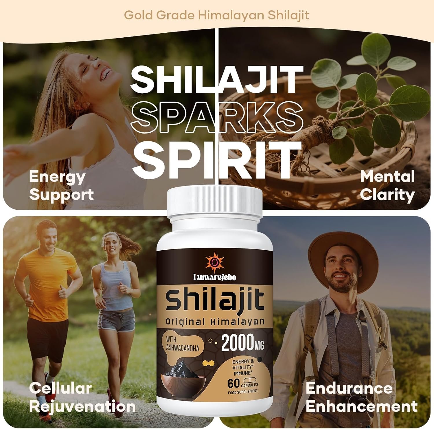 Shilajit Capsules 2000MG, Gold Grade 100% Pure Himalayan Shilajit, High Strength with Ashwagandha, 60% Fulvic Acid & Minerals, Energy & Immune Support for Men & Women, 60 Count (Pack of 1)