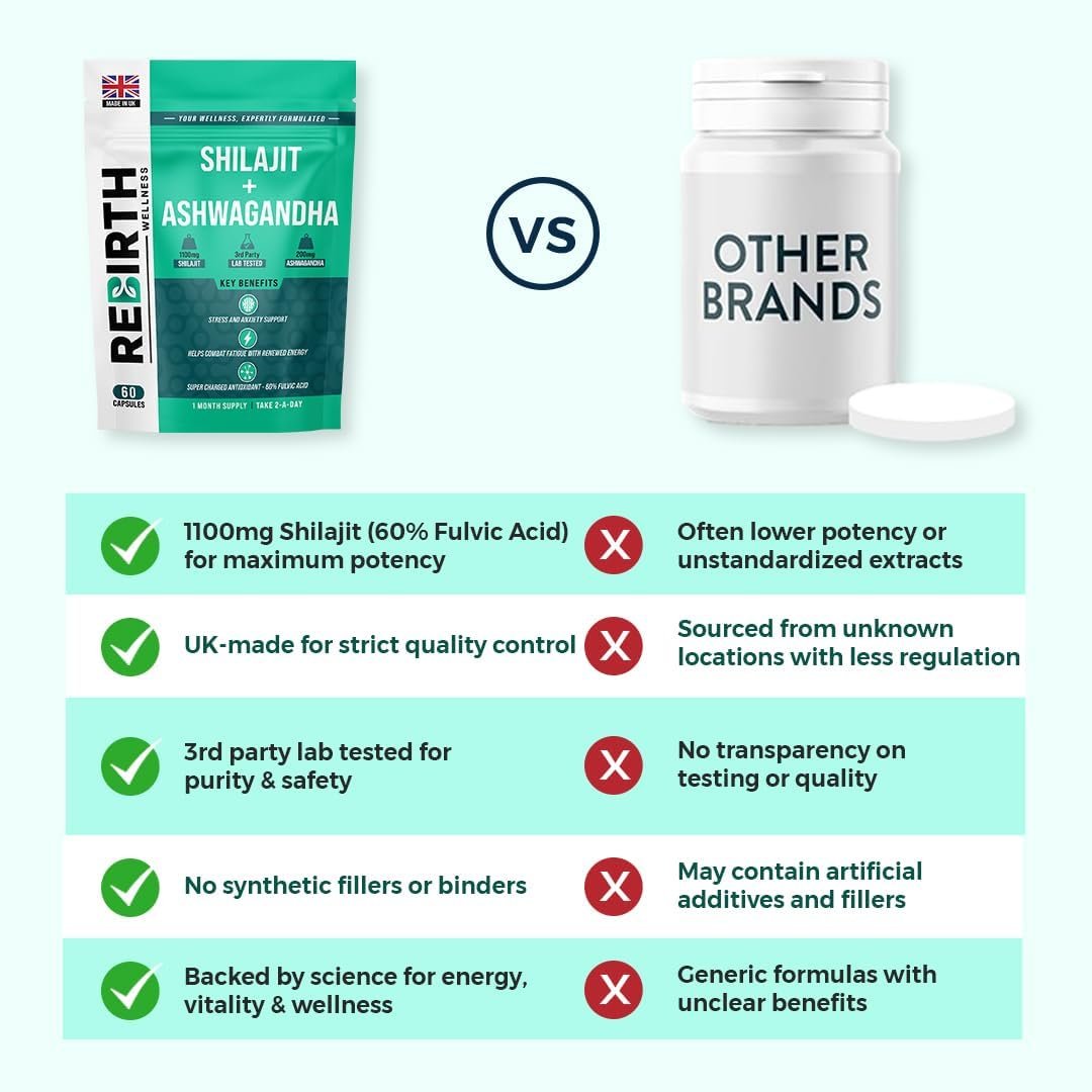 High Potency: Our UK-made Shilajit & Ashwagandha capsules offer 1100mg of potent Shilajit & 200mg Ashwagandha Root Extract per serving, for renewed energy and stress & anxiety support.