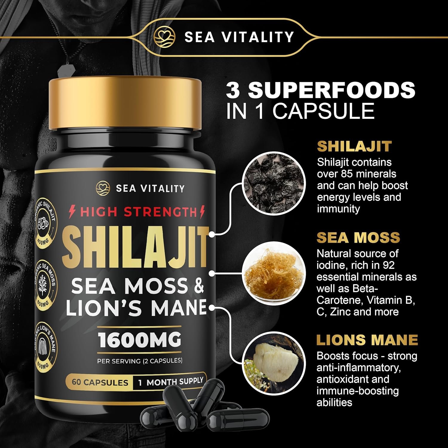 Shilajit Seamoss and Lions Mane Capsules – 60 High-Strength Vegetable Capsules, 1600mg per Serving, Pure Shilajit, Natural Sea Moss, and Lion’s Mane for Enhanced Cognitive and Physical Health