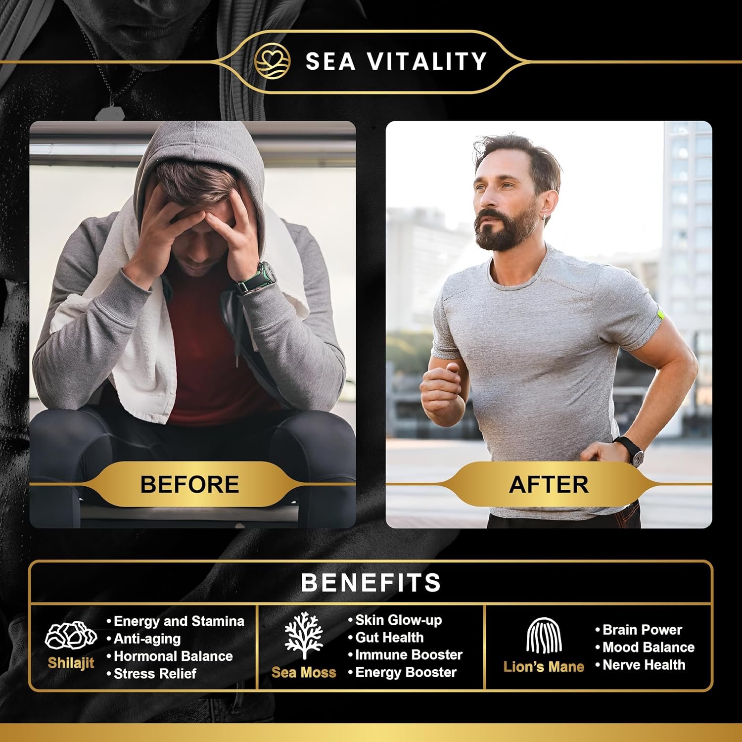 Easy-to-Take Taste-Free Capsules – Enjoy the benefits of Shilajit, Sea Moss and Lion’s Mane without the earthy taste of resin or gel. Convenient vegan capsules make daily use simple, clean and mess-free — ideal for men and women seeking a natural wellness boost.