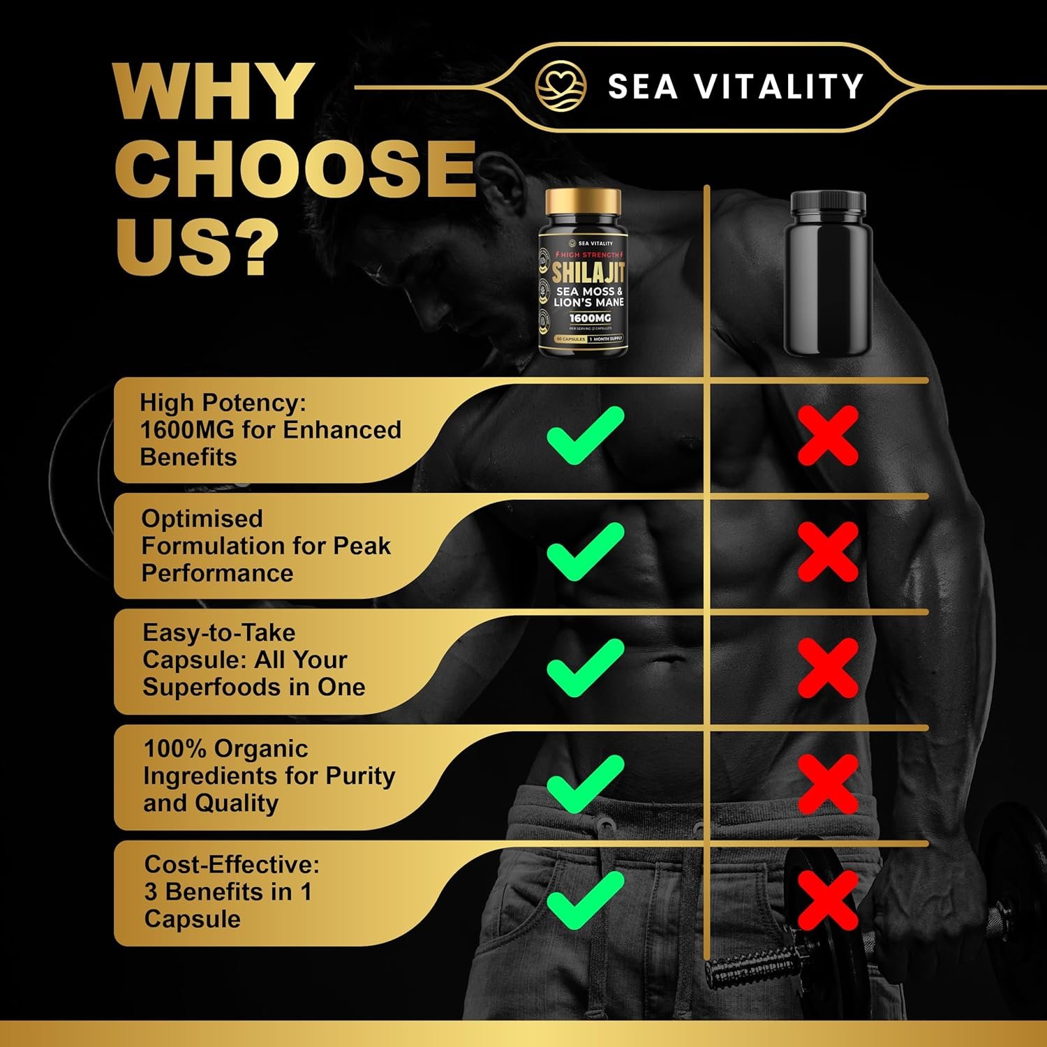 Potent Shilajit Lions Mane & Sea Moss Capsules – Each serving offers 400 mg of Himalayan Shilajit plus Lion’s Mane and Sea Moss extract for balanced daily wellness. A powerful alternative to Shilajit gummies or resin — crafted for clarity, stamina and modern men’s active lifestyles.