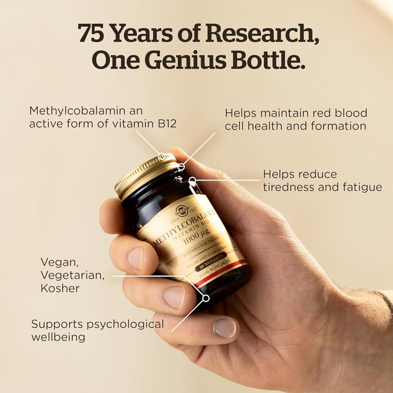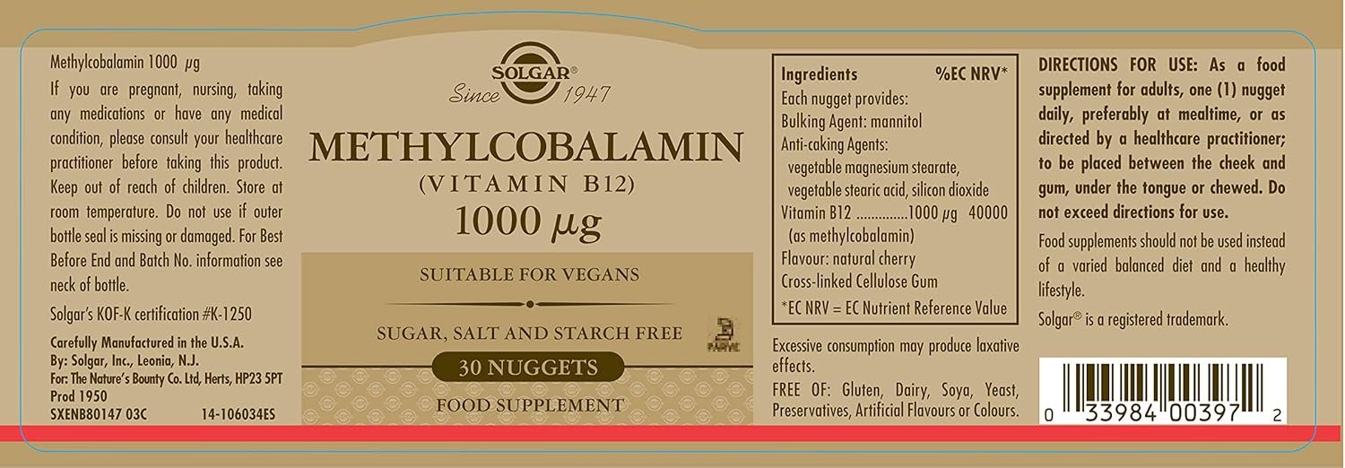 HIGH STRENGTH, EASY TO TAKE. The “body-ready” Solgar Methylcobalamin (Vitamin B12) nuggets contain 1000 μg of this naturally occurring form of Vitamin B12. It plays a number of different roles in the body such as reducing tiredness, assisting in the release of energy from foods and supporting your vitality