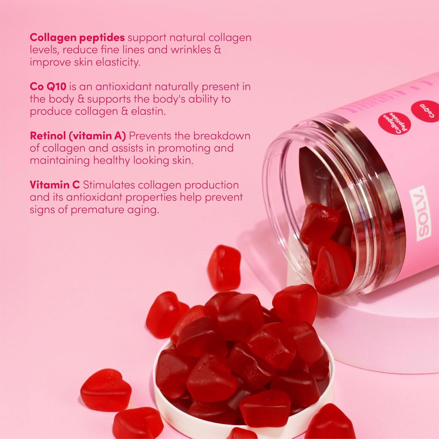 HIGH STRENGTH FORMULA ENRICHED WITH COENZYMEQ10 (COQ10), BIOTIN, AND VITAMINS A, C AND E The SOLV. Collagen gummies are the ultimate age-resisting supplement. They are scientifically formulated to support collagen formation from three angles. First, the gummies increase the body’s collagen intake thanks to the collagen peptides. Then, Coenzyme Q10 and vitamin C help the body produce its own collagen. Finally, vitamin A is known to prevent the breakdown of collagen.