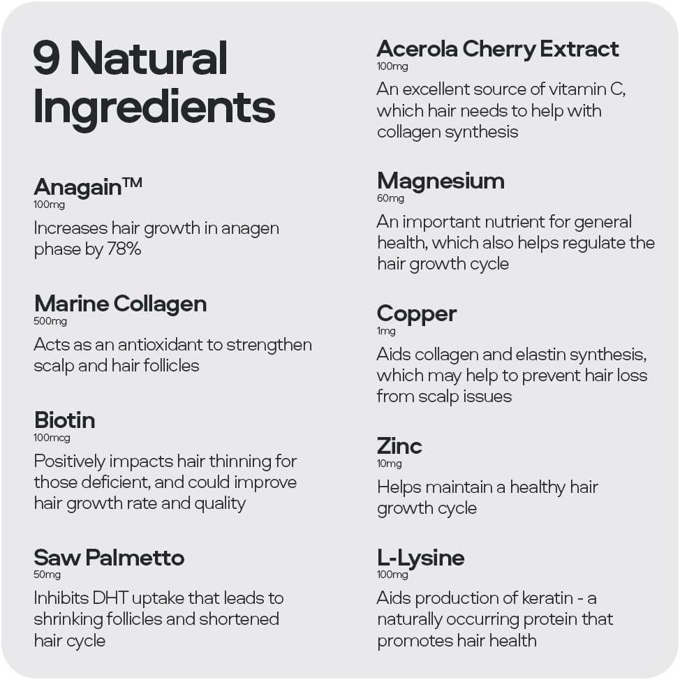 WHAT IS INCLUDED? 1x jar (60 capsules) with marine collagen, acerola cherry, L-lysine, Anagain, magnesium, saw palmetto, zinc, copper, and biotin.