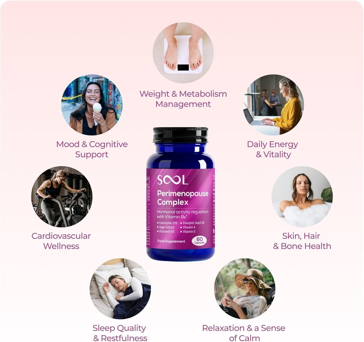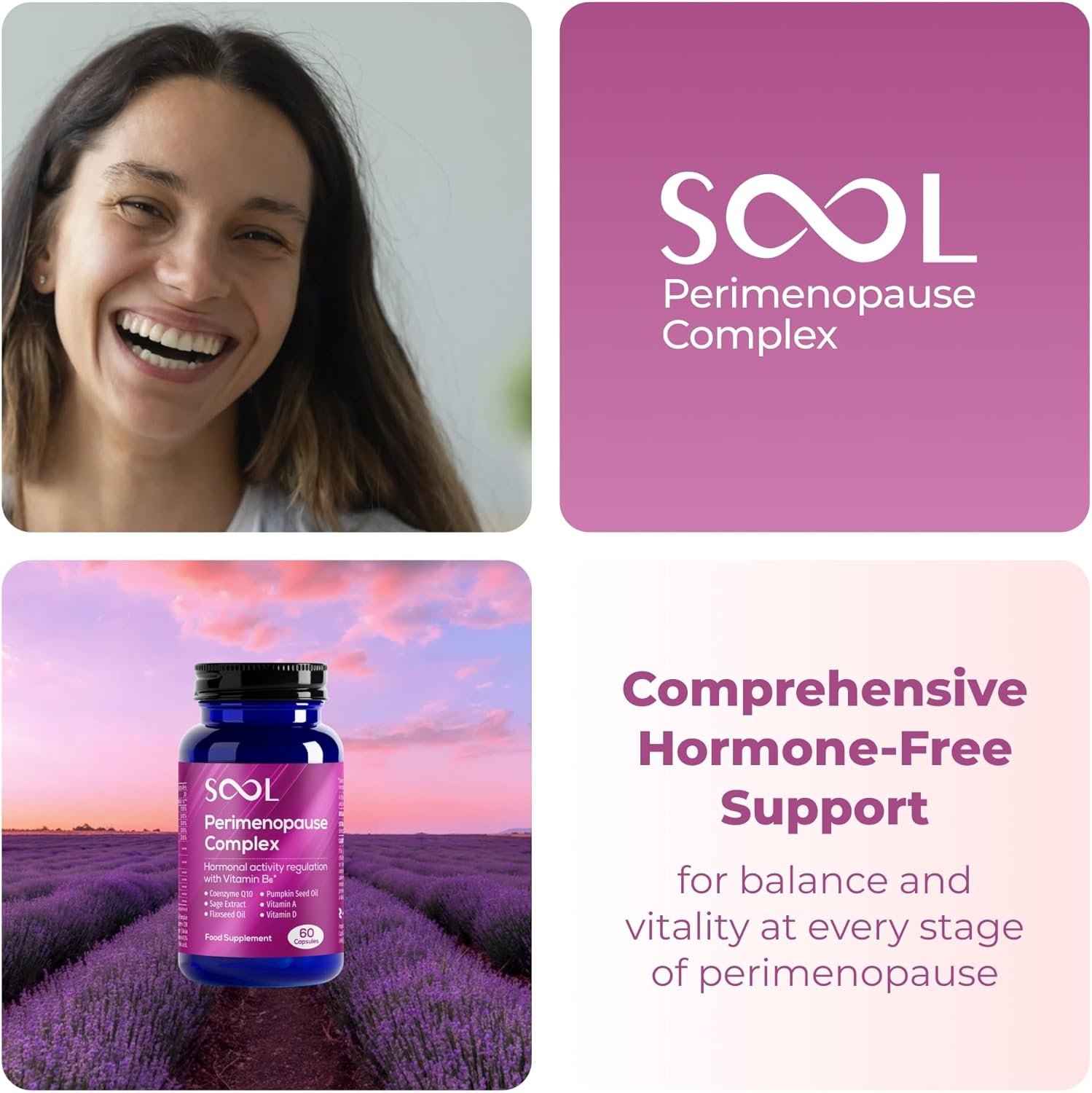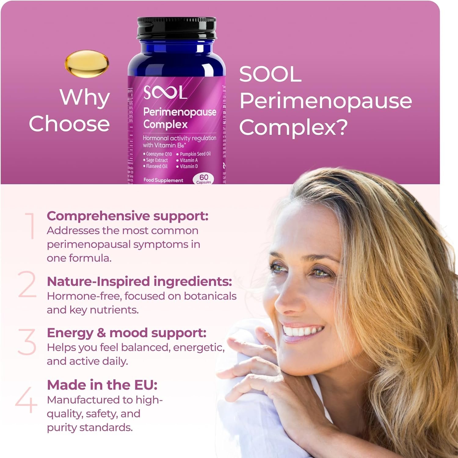 🌟 Powered by Coenzyme Q10: Experience a more innovative way to support your body through perimenopause with the newly released SOOL Perimenopause Complex. Thoughtfully formulated to help restore hormonal balance, boost energy, and support overall well-being, it delivers targeted daily support in easy-to-swallow capsules. At the heart of the formula is Coenzyme Q10, a powerful antioxidant that enhances cellular energy, supports heart function, and helps fight fatigue during hormonal changes.