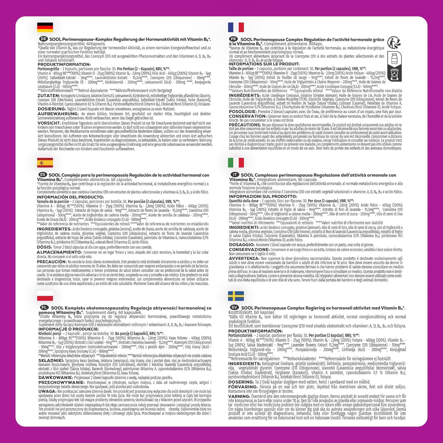 🇪🇺 European-Made, GMP Certified & Third-Party Tested for Purity: SOOL Perimenopause Complex is produced in Europe and manufactured under strict GMP (Good Manufacturing Practice) guidelines. Each batch is third-party tested to ensure purity, potency, and quality. We carefully source our ingredients to create a clean, effective, and cruelty-free food supplement designed to support hormonal activity regulation during perimenopause.