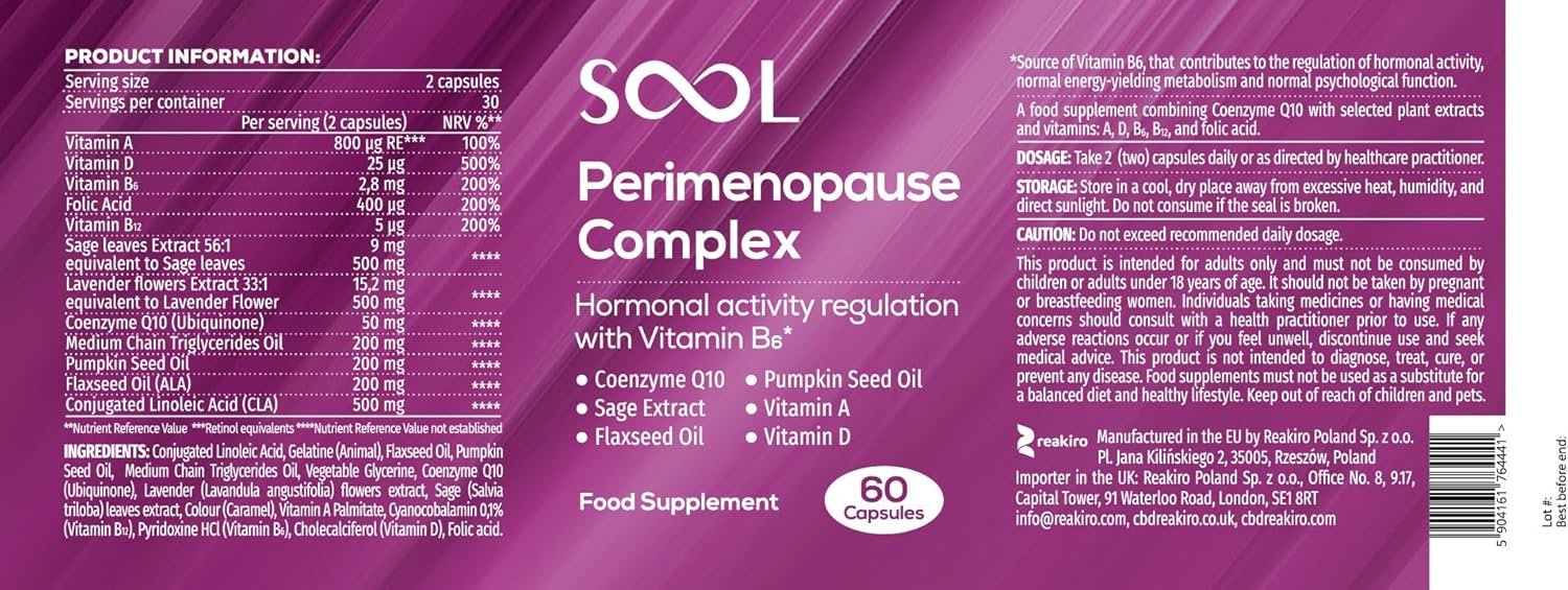 • Includes key ingredients: Contains essential ingredients to support the perimenopause phase, including Vitamin B6 for maintaining normal psychological function, flaxseed oil for its omega-3 fatty acids and natural phytoestrogens, and sage leaf extract, commonly used to ease this transitional stage.