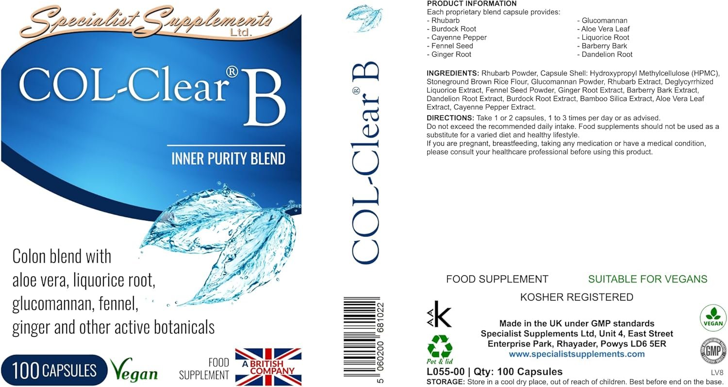 COL-Clear B is a herbal colon care product with a tailored combination of rhubarb, burdock root, cayenne, fennel seed, ginger root, glucomannan, aloe vera, liquorice root, barberry bark and dandelion root. Popular with colonic hydrotherapists for use before, during and after treatments, it is ideal as part of a body detox / body cleanse programme. Suitable for vegans.