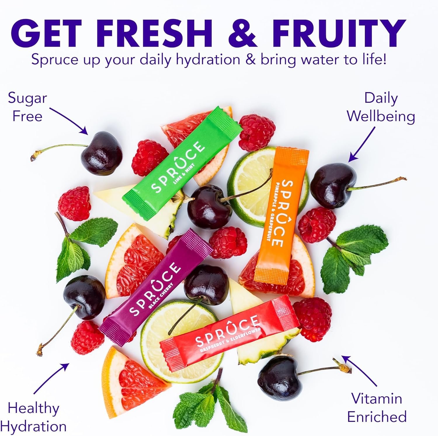 We’re on a mission to make water tasty and to help you drink as much of it as possible. Spruce’s Hydration Sachets are also sugar free!