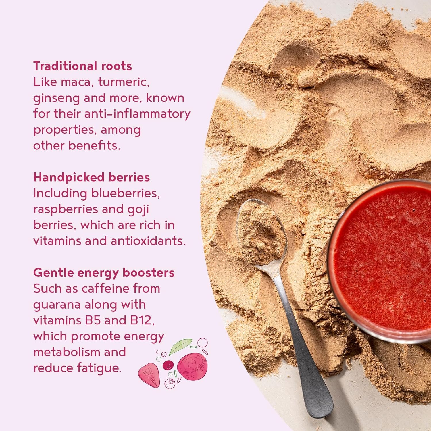 📌 HOW TO USE: With a recommended daily serving of 30g, our 600g pouch provides 20 servings and our berry powder can be added to water, smoothies, juice and breakfast oats so is easy to incorporate into your daily routine. Our superfood blend shake has a subtle earthy flavour from the highly concentrated and beneficial roots.