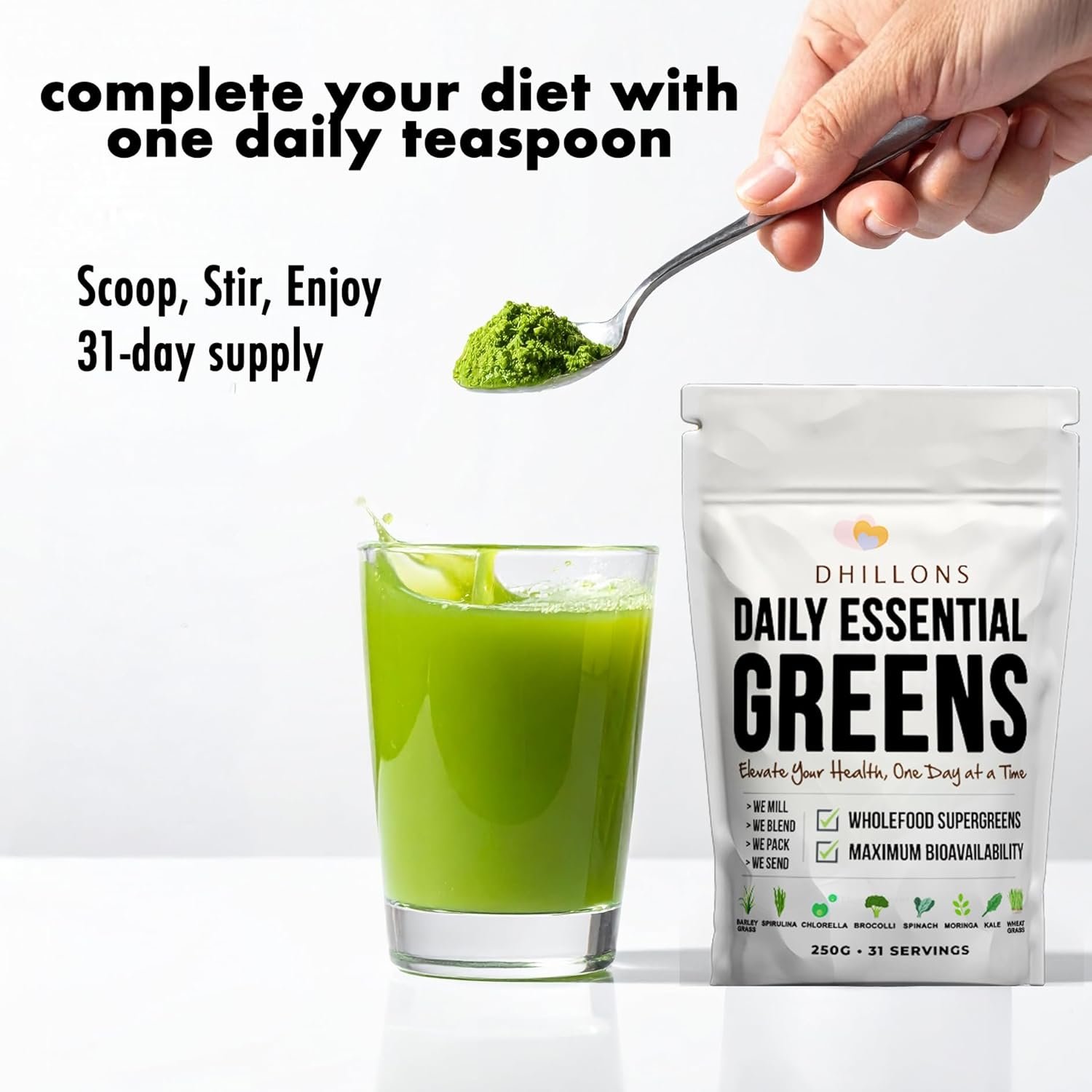 🥄 ONE HEAPING TEASPOON A DAY – SCOOP. STIR. ENJOY. 🥄 Just one full teaspoon (≈8 g) mixed with 250 ml cold water or smoothie gives you your daily dose of greens – quick, refreshing, and effortless.