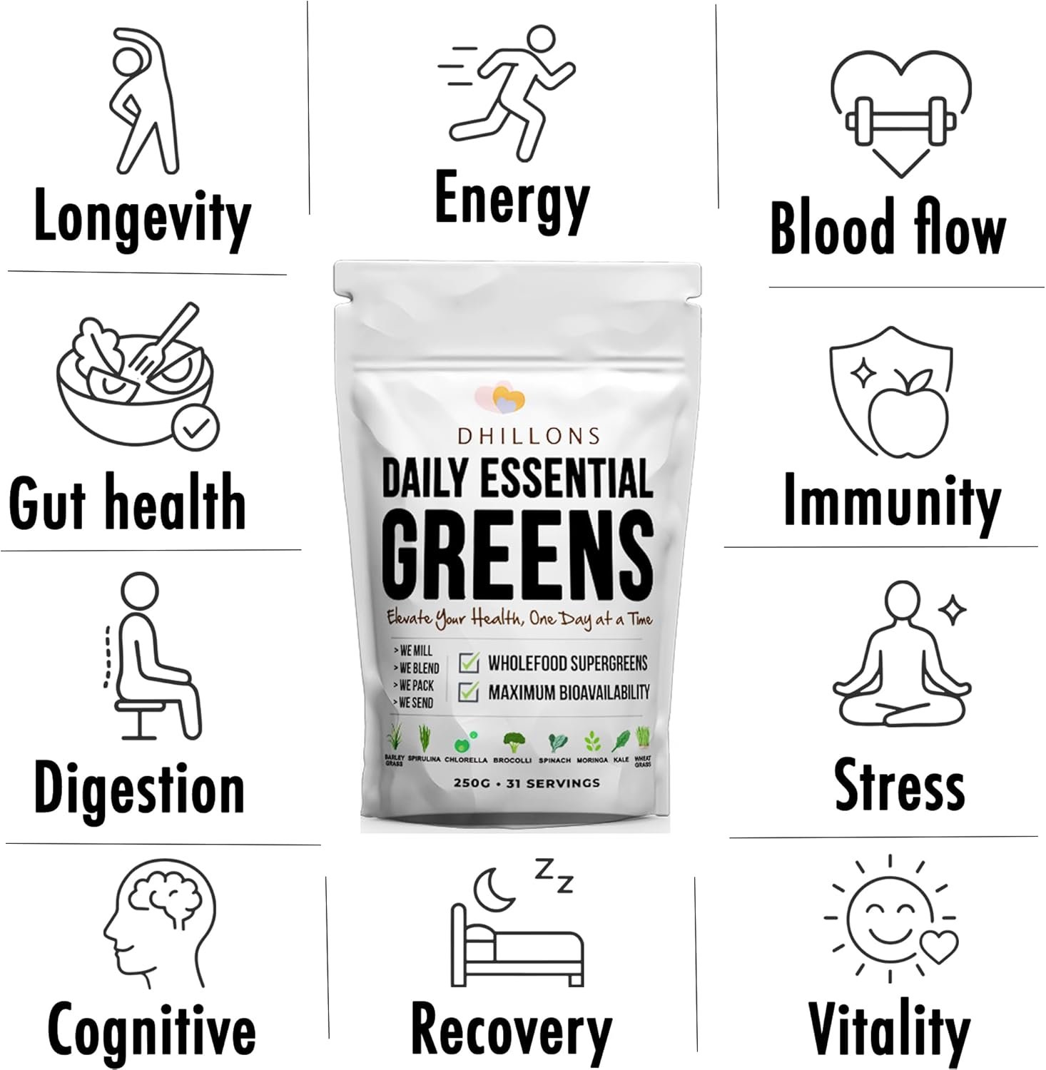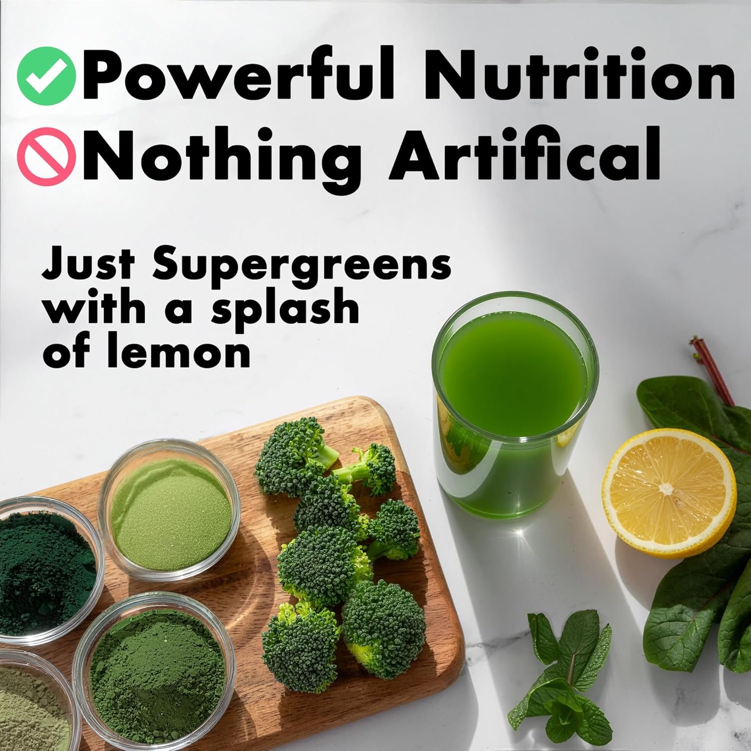 🧬 OPTIMAL SUPERGREENS FORMULA 🧬 8 core greens: Kale, moringa, broccoli, spirulina, chlorella, spinach, wheatgrass & barley grass – with lemon & spearmint for a refreshing natural flavour.