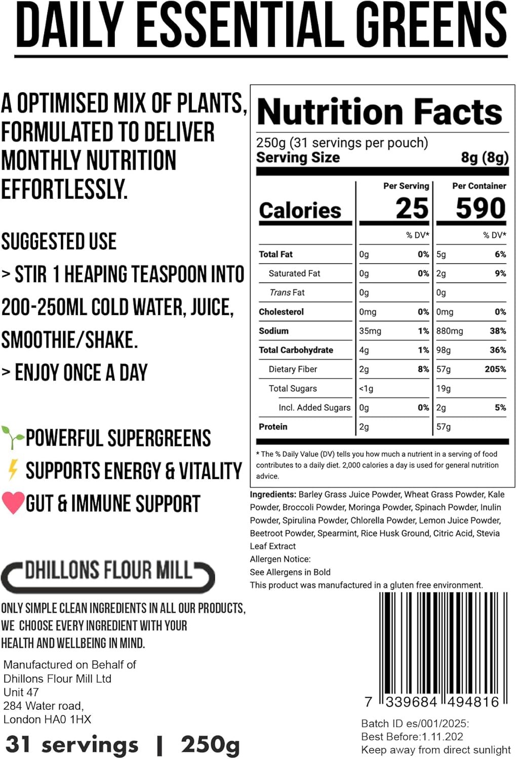 🥬 PURE WHOLEFOOD GREENS 🥬 – NO FILLERS OR SYNTHETICS Freshly milled and blended by experts – no fillers, gums, E-numbers, or synthetic vitamins. Just pure whole plants for an optimal nutrition boost.