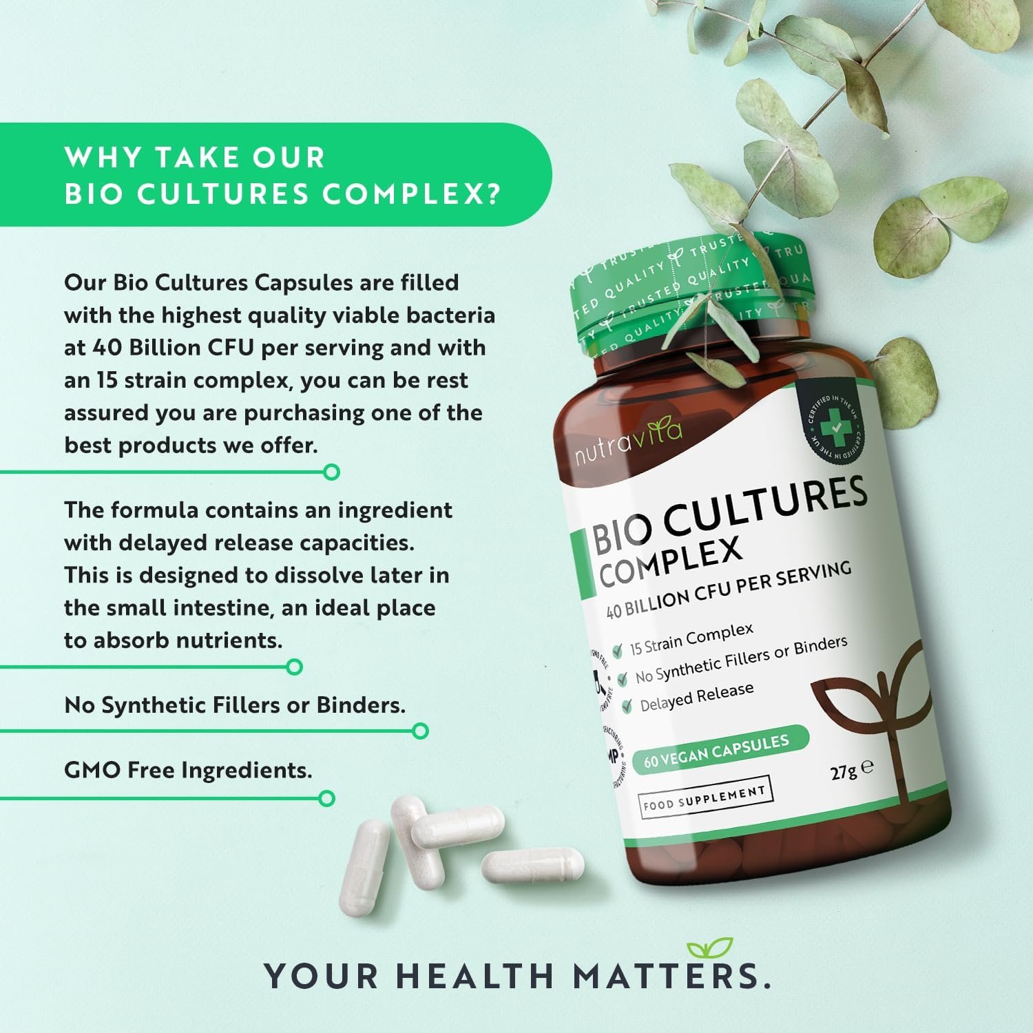 Super Strength 40 Billion CFU Bio Cultures Complex with 15 Live Strains – Advanced Multi Strain Formula – Vegan Capsules – Digestive Enzyme Supplement for Men & Women – Made by Nutravita