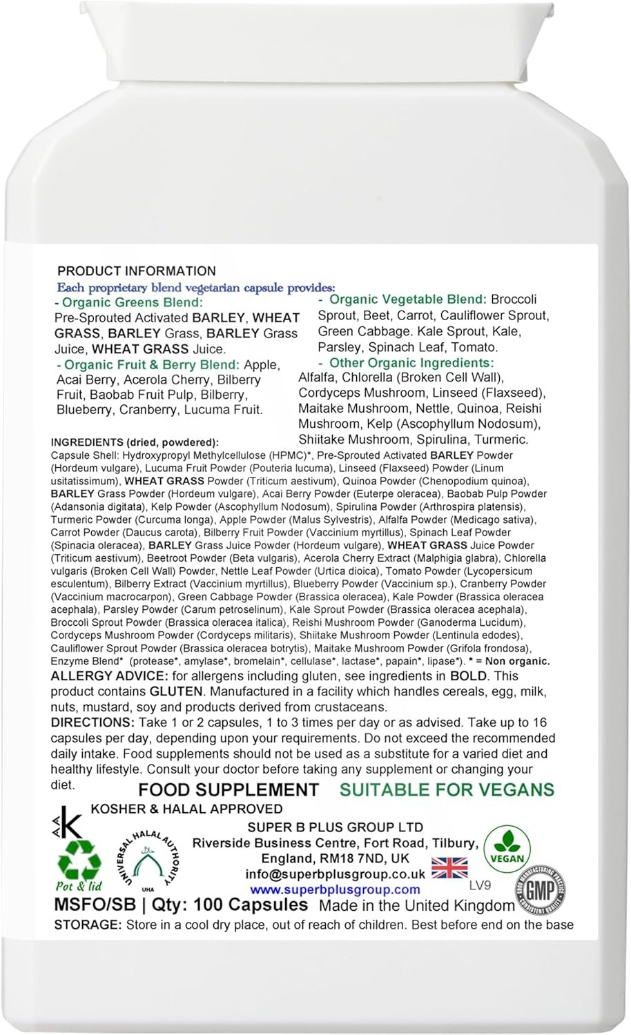 35+ Organic Superfoods in One Capsule: Get your daily dose of essential nutrients with a diverse blend of organic fruits, vegetables, greens, berries, seeds, and herbs.