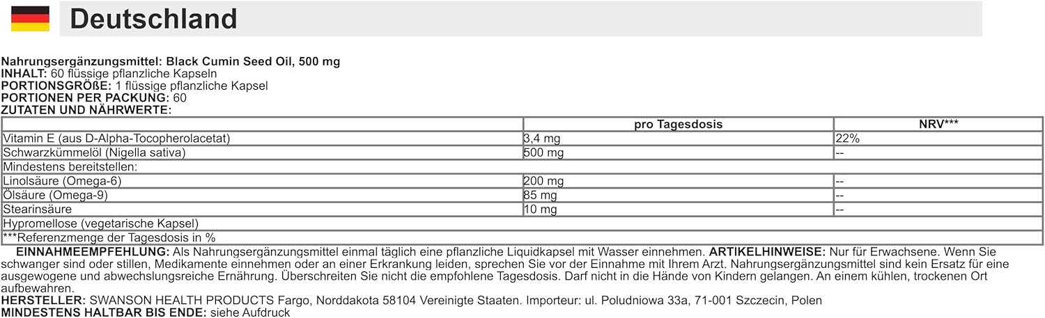 Swanson Black Cumin Seed Oil provides 500mg of cold-pressed Nigella sativa per softgel, rich in naturally occurring essential fatty acids. Long used for immune health and inflammation balance, this seed oil is a natural choice for everyday cellular and immune function support. One bottle includes 60 softgels for a full month of use.