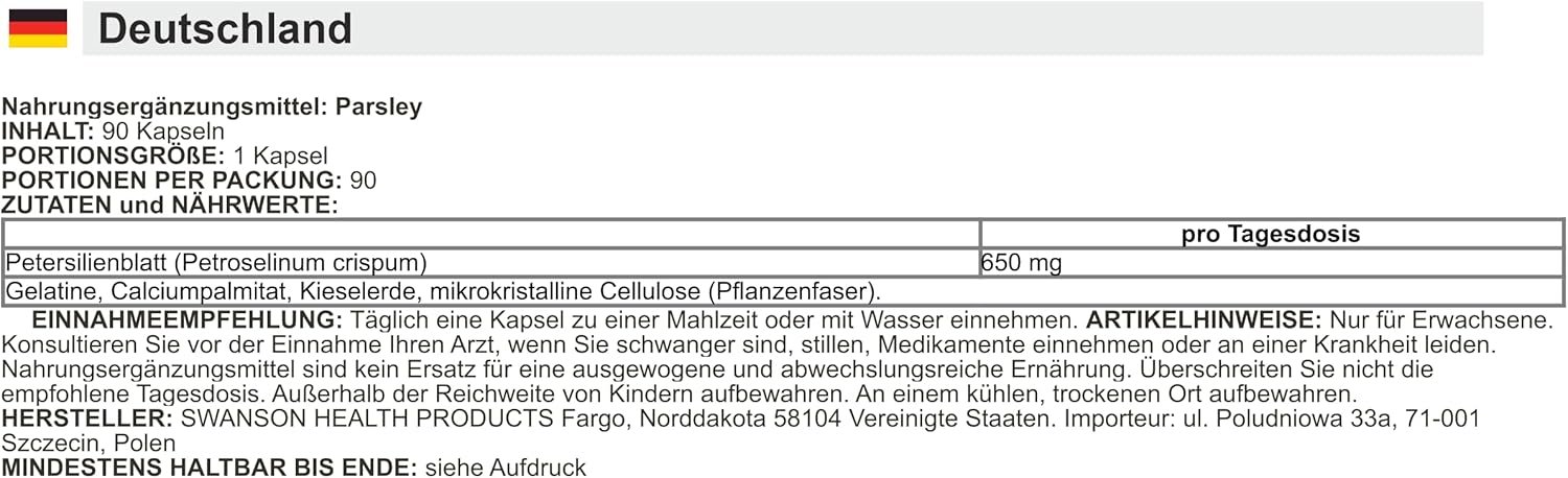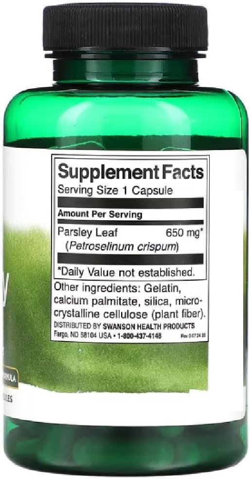Swanson Parsley Capsules offer 650mg per capsule to support kidney and urinary health. Parsley is known for its detoxifying properties. Each bottle includes 90 capsules for daily kidney support.
