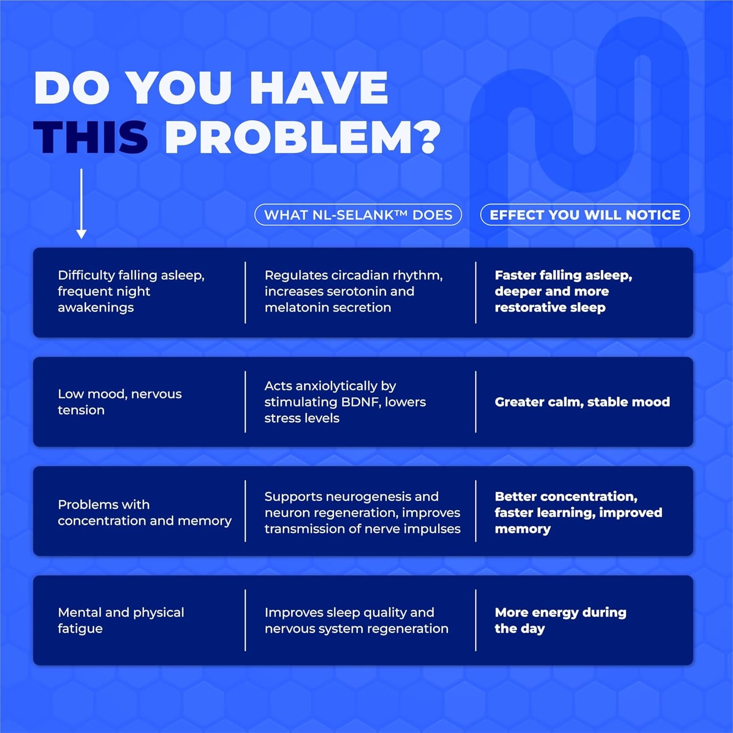 SLEEP REGULATION & EASIER TO SLEEP – NL-Selank makes it easier to fall asleep, improves sleep quality and regulates circadian rhythm, resulting in increased vitality and energy during the day.