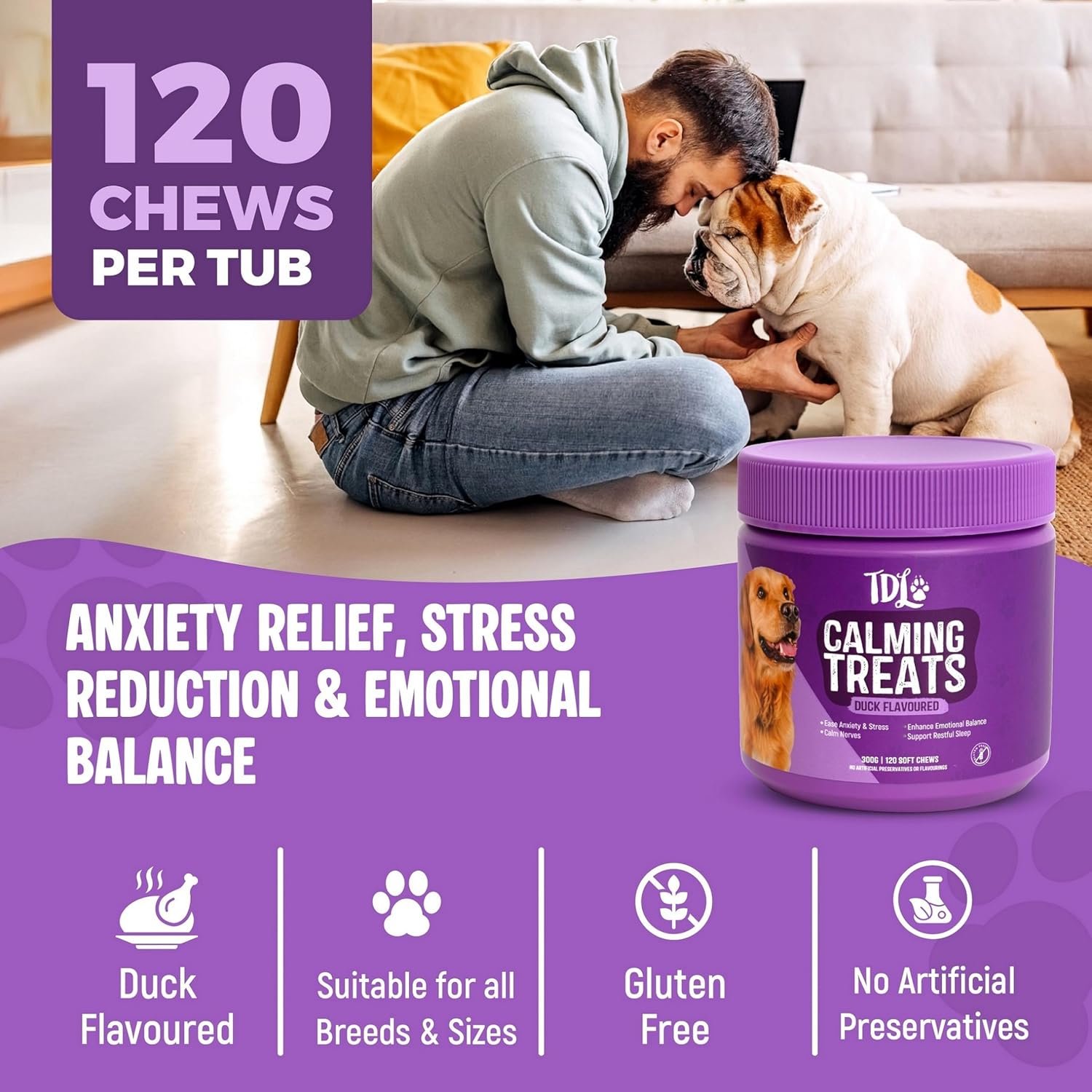 TDL Calming Dog Treats – 120 Soft Chews – Natural Duck Flavour – Dog Calming Tablets That Work – Stress & Anxiety Relief