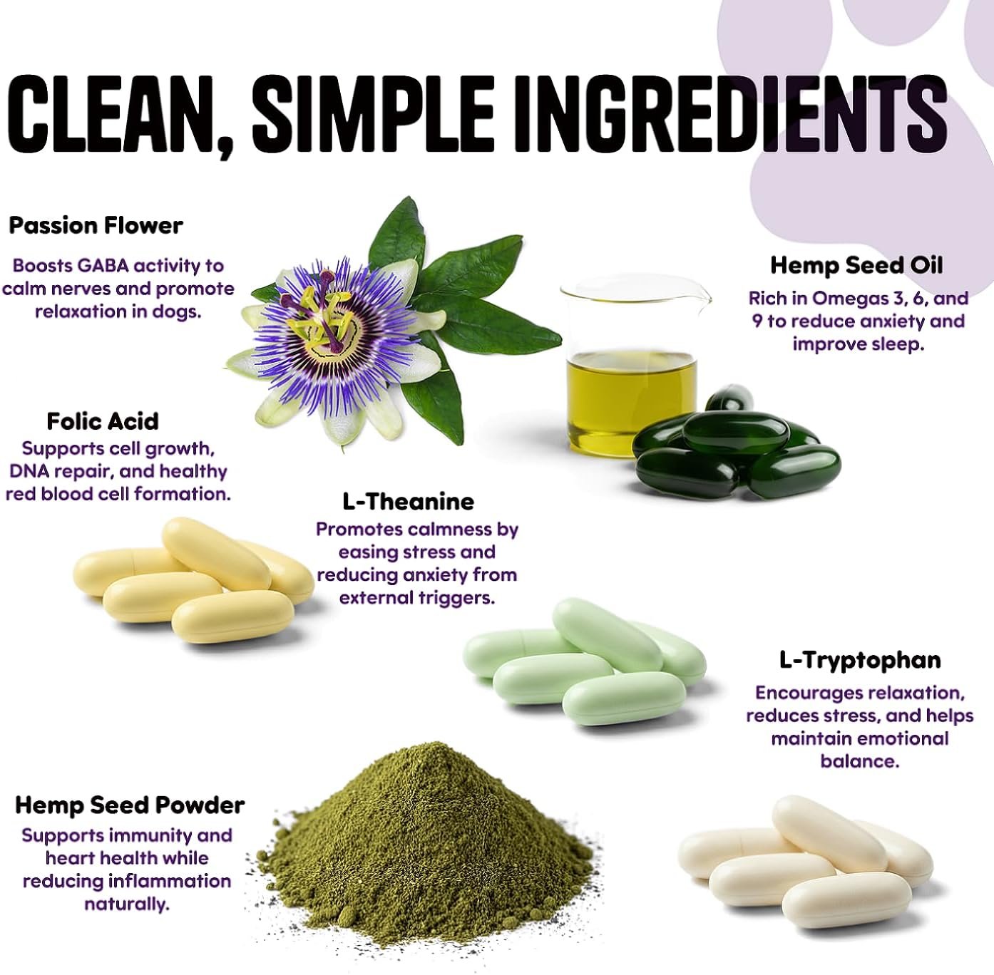 Total Stress Relief Without the Drama: Designed for all life stages, these dog calming chews help manage stress triggers like travel, storms, or vet visits. Ingredients like L-Tryptophan, Passion Flower, and Folic Acid work together to ease nervousness and promote a peaceful mood.