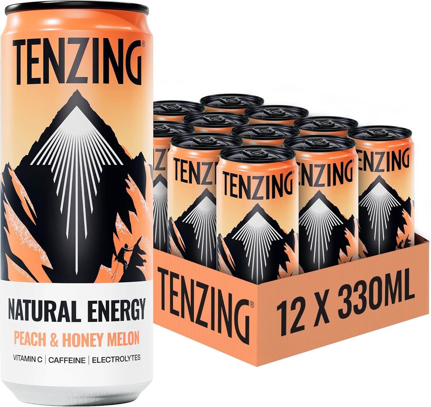 TENZING Natural Energy Drink, Plant Based, Vegan, & Gluten Free Drink, Peach & Honey Melon, 330ml (Pack of 12) – Packaging may vary