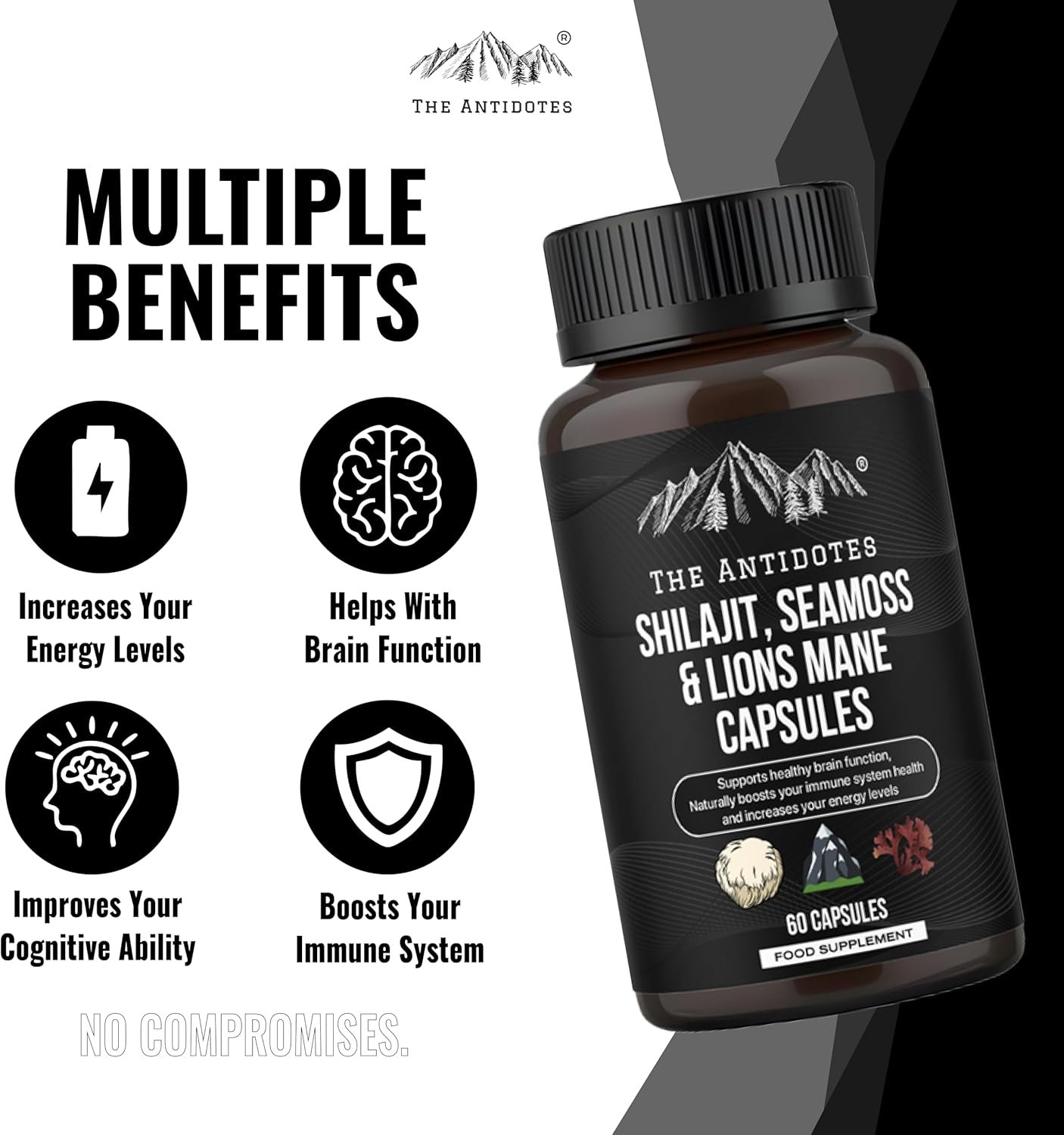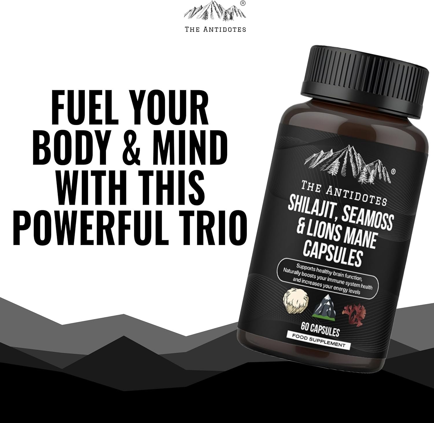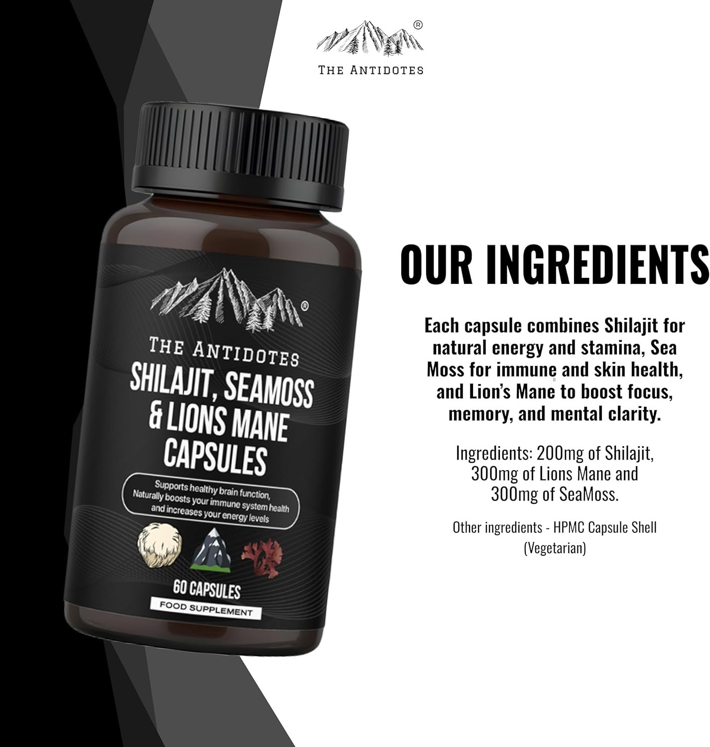 The Antidotes Shilajit, Sea Moss and Lion’s Mane Capsules – 3-in-1 Superfood Supplement – Natural Energy, Immunity & Focus – Vegan, Gluten-Free & Pure – 60 Capsules (30–60 Day Supply)