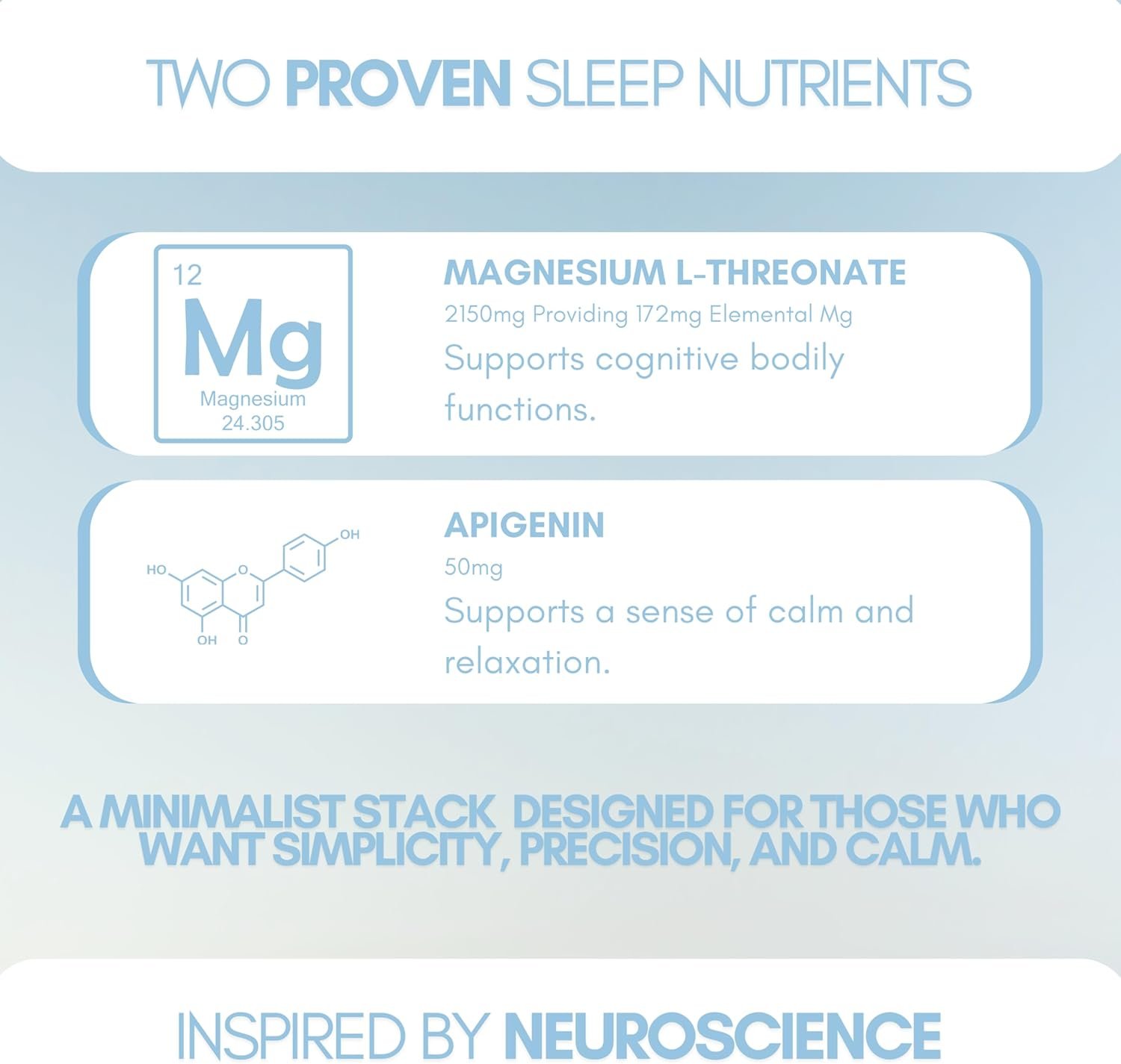 💤 Premium 2-in-1 Night Formula Combines two clinically studied ingredients — Magnesium L-Threonate and Apigenin — to support restful, restorative sleep and relaxation without grogginess.