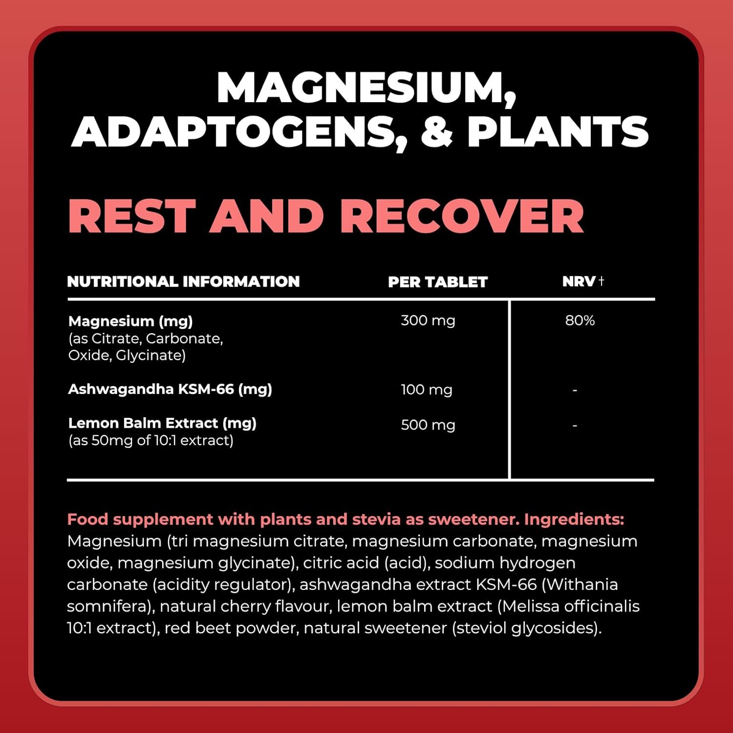 4-in-1 FORMULA MAGNESIUM SUPPLEMENTS – combines hydration, adaptogens, minerals, and plants- a powerful blend of 300mg of magnesium, 100mg of KSM-66 Ashwagandha, and 500mg of Lemon Balm. This formula expertly supports relaxation and recovery.