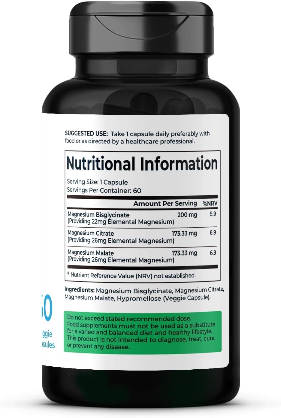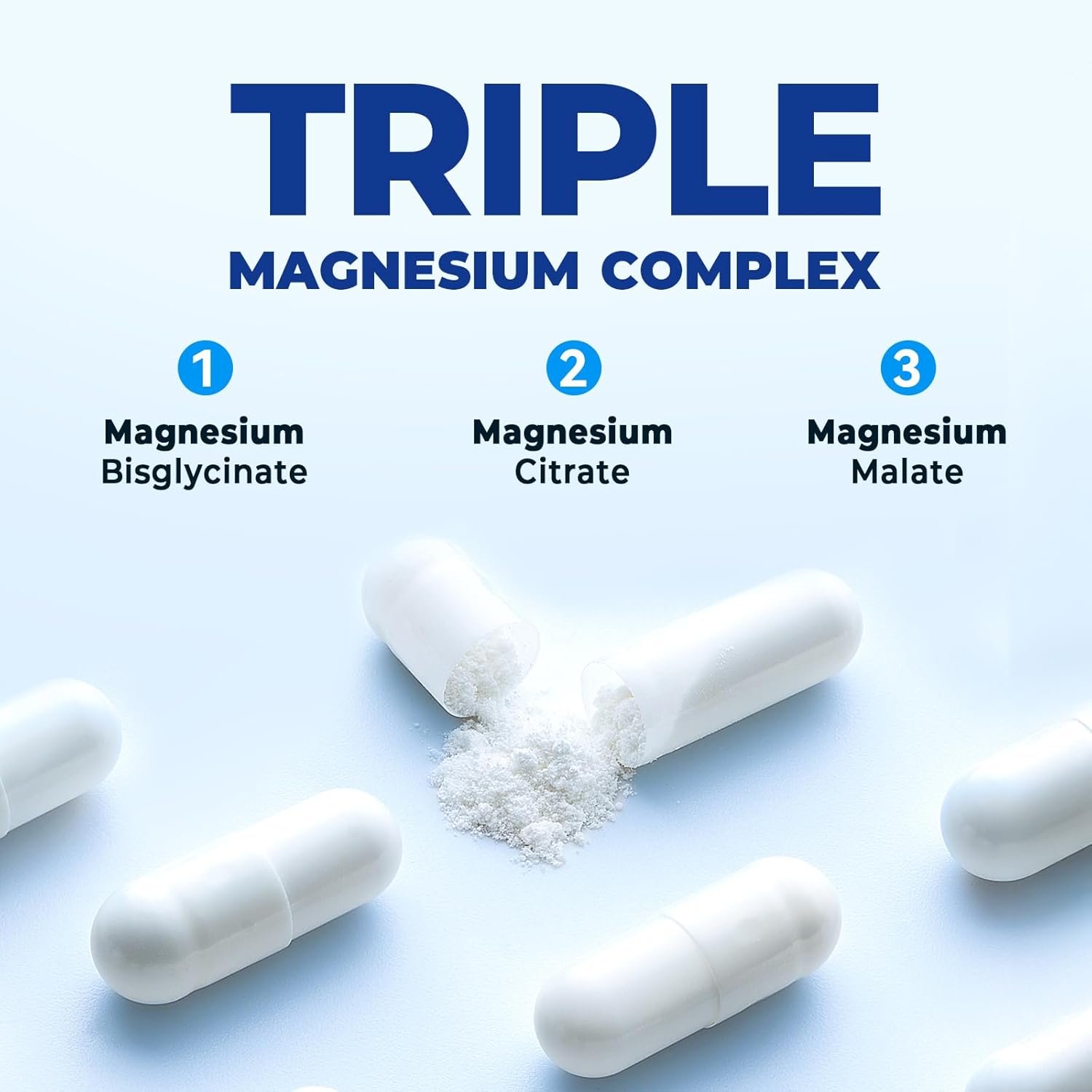 Triple Magnesium Complex 500mg 3-in-1 Supplement, Magnesium Bisglycinate, Citrate & Malate Supplement, 60 Vegan Capsules for Muscle, Heart, Immune and Relaxation Support