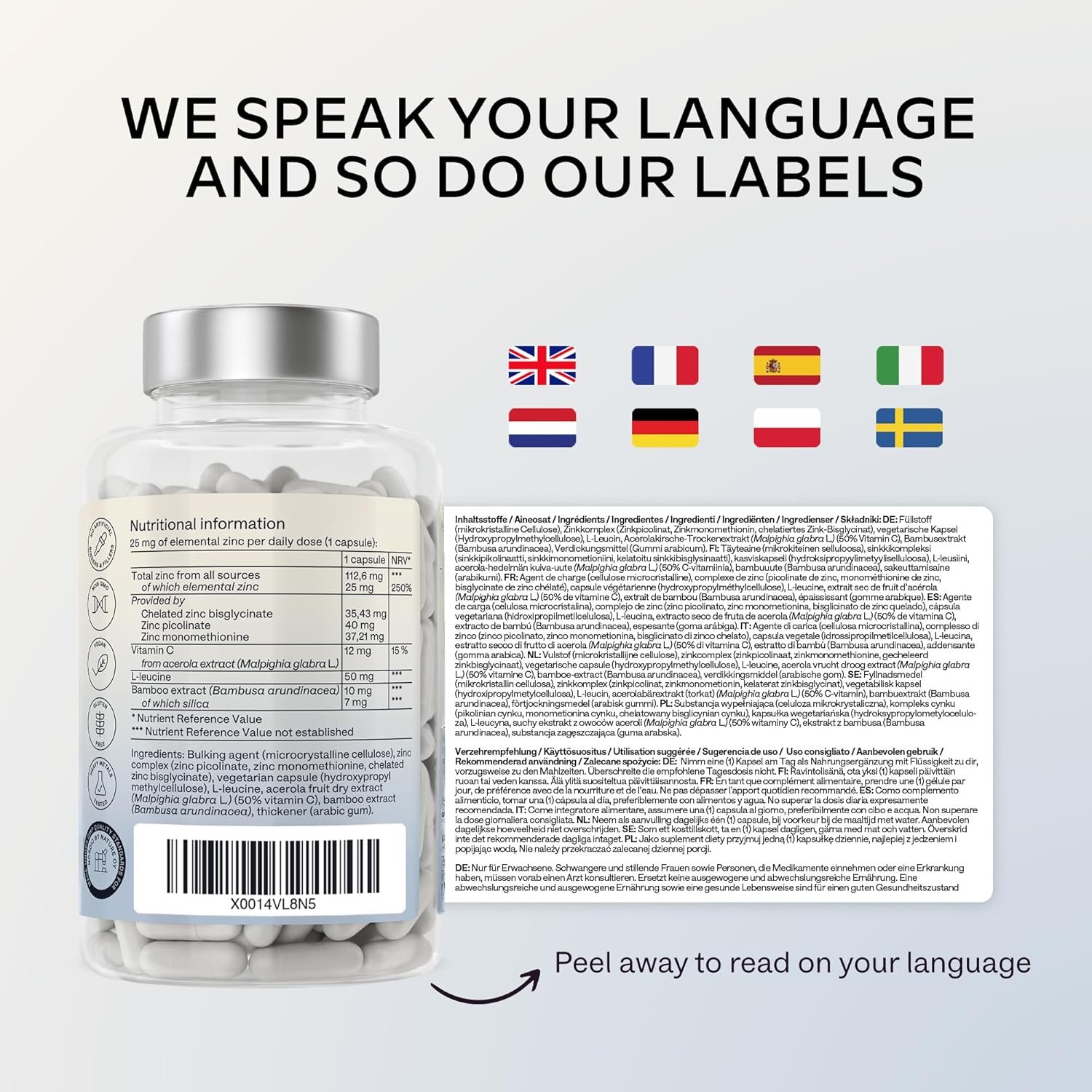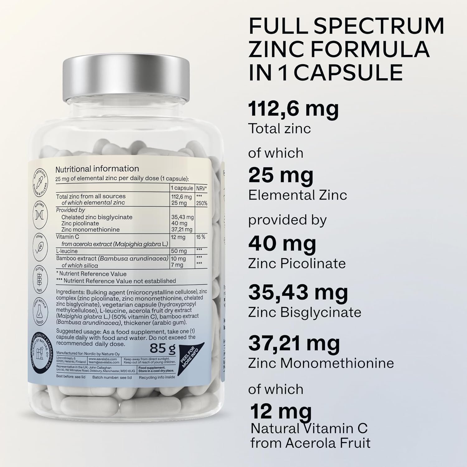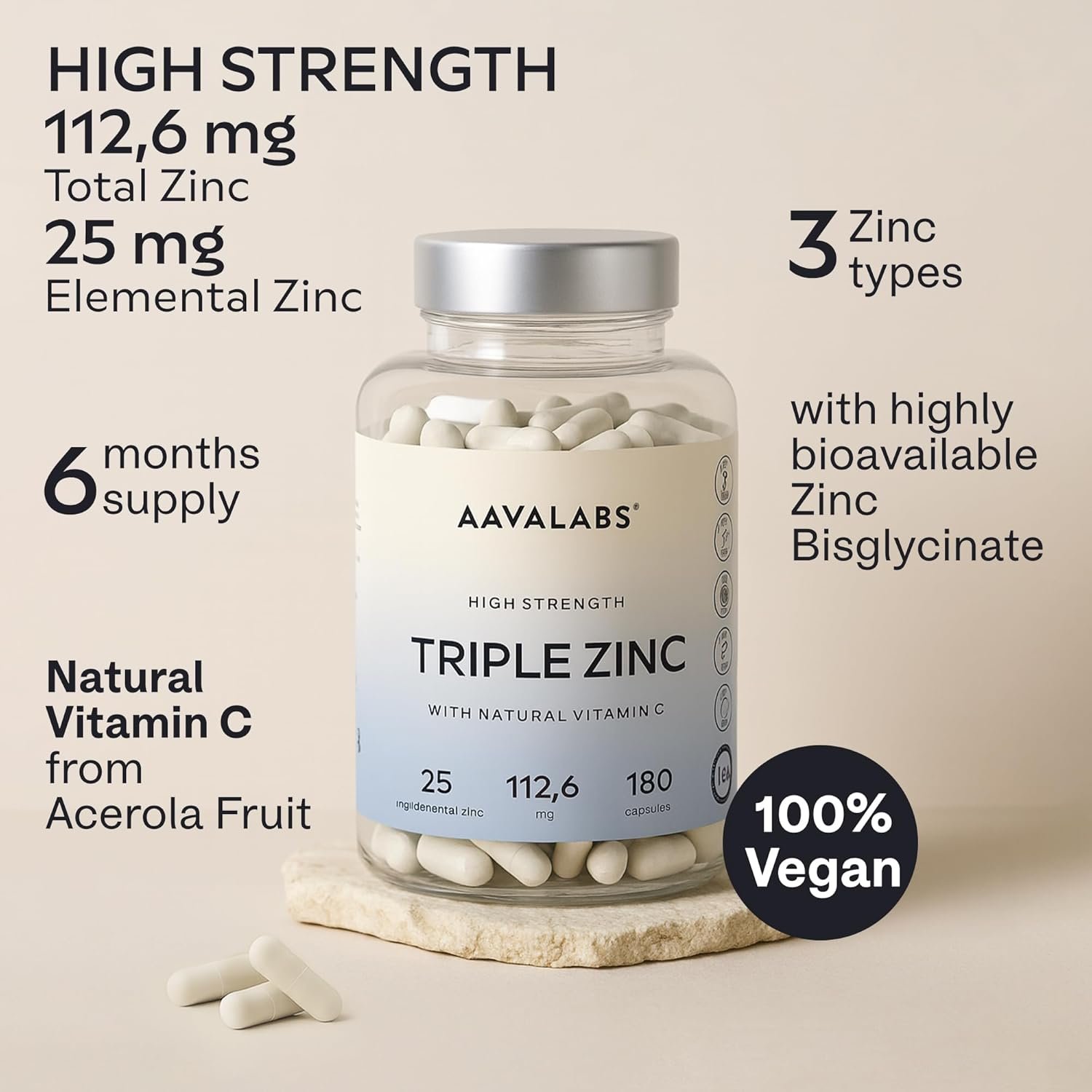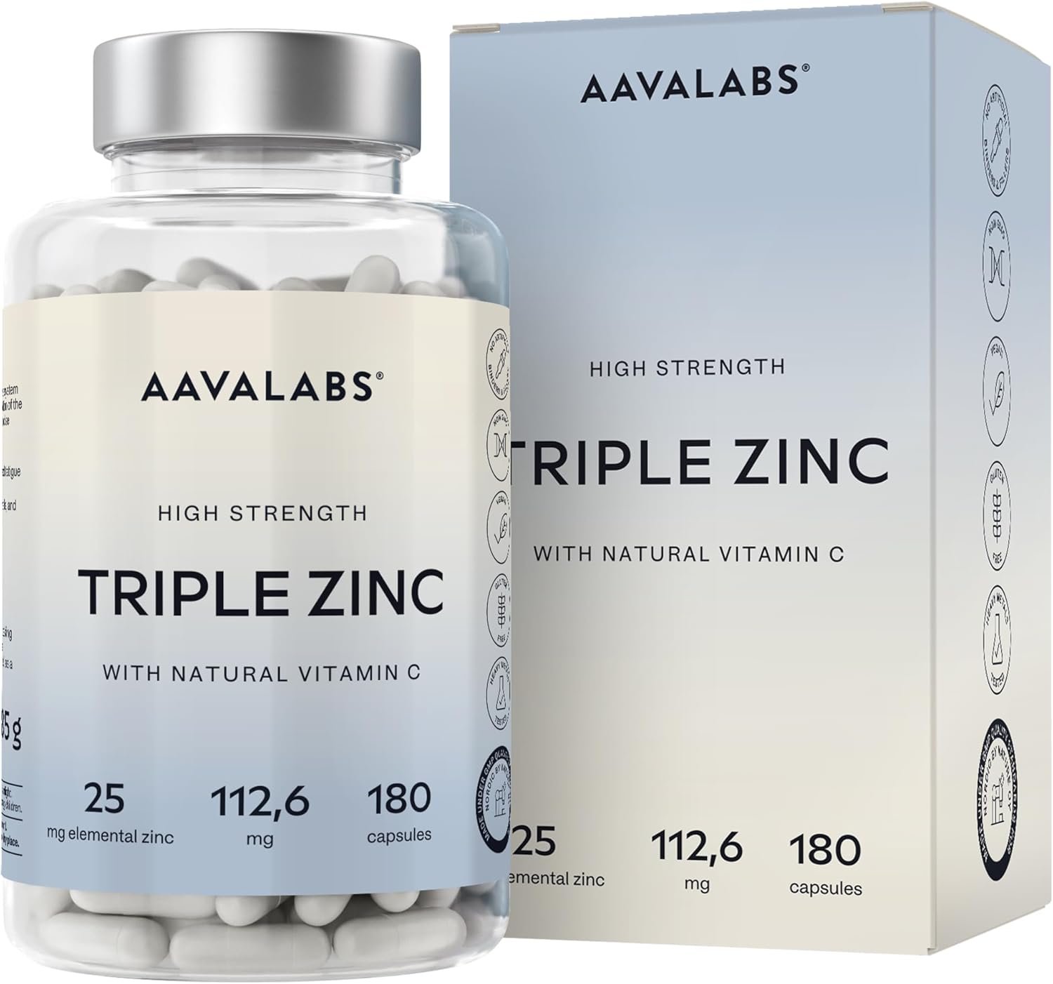 Triple Zinc Supplements for Men and Women – 25mg – with Natural Vitamin C – Zinc Picolinate, Bisglycinate and Monomethionine – 180 Capsules – 6 Months Supply