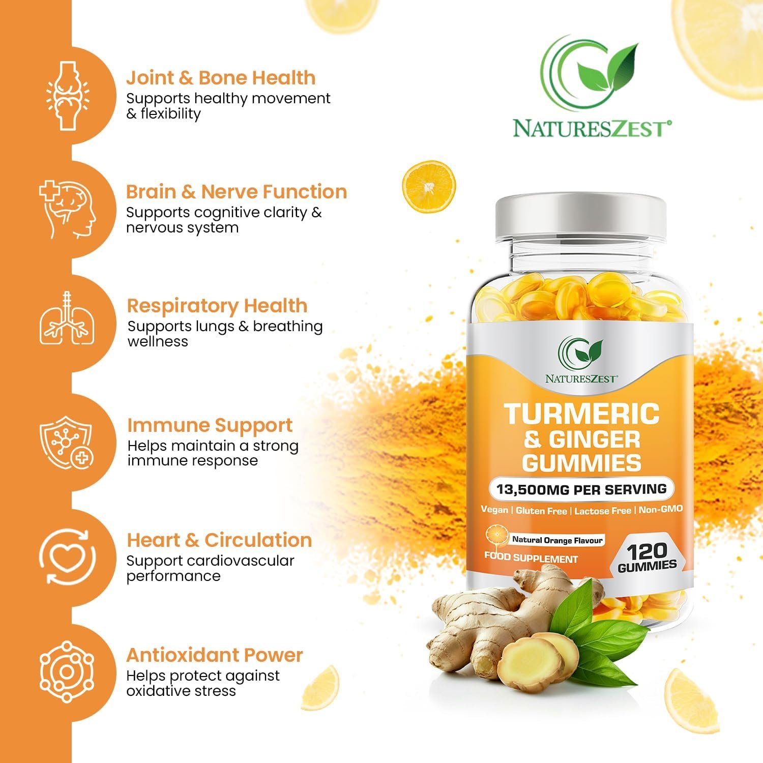 Turmeric and Ginger Gummies High Strength –13,500mg | Joint, Immune & Digestive Support | Vegan, Gluten-Free, Non-GMO, Lactose-Free 120 Chewable Gummies | Natural Orange Flavour by NATURES ZEST